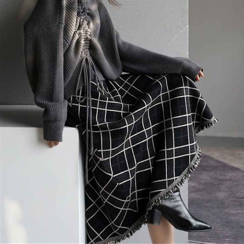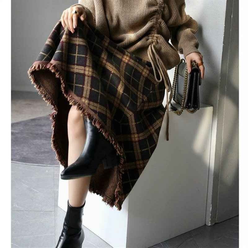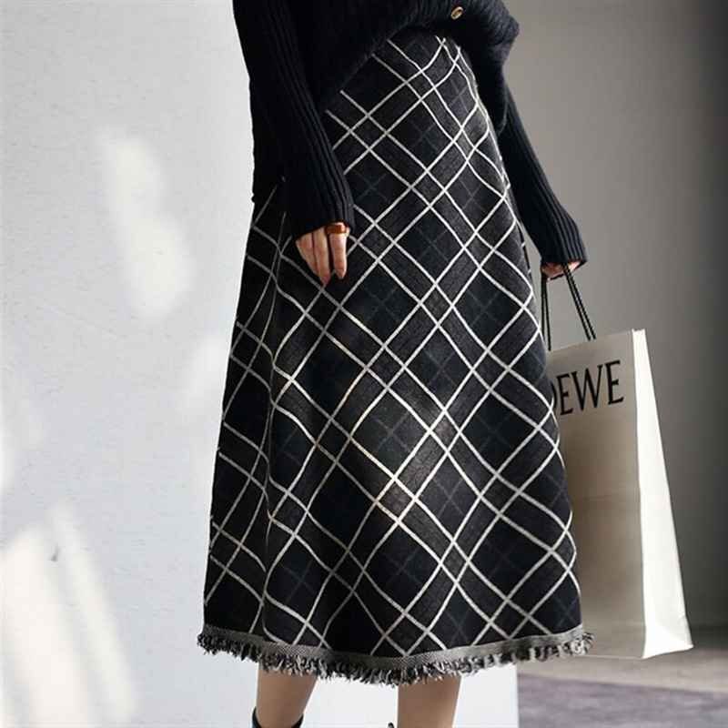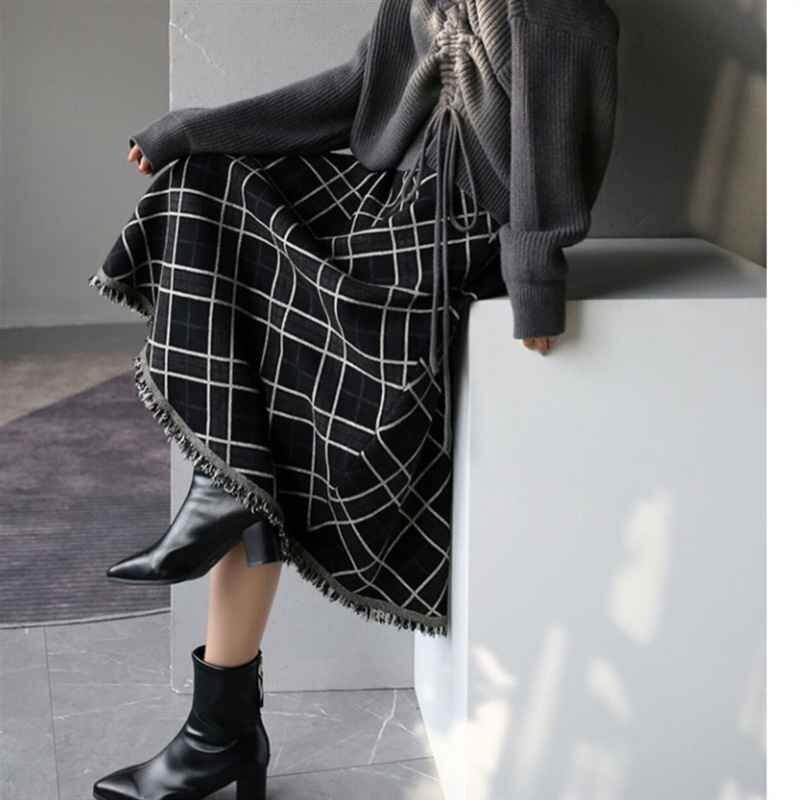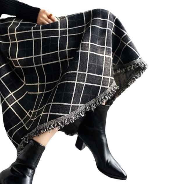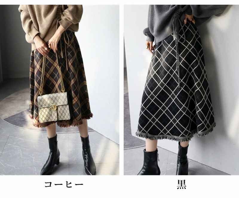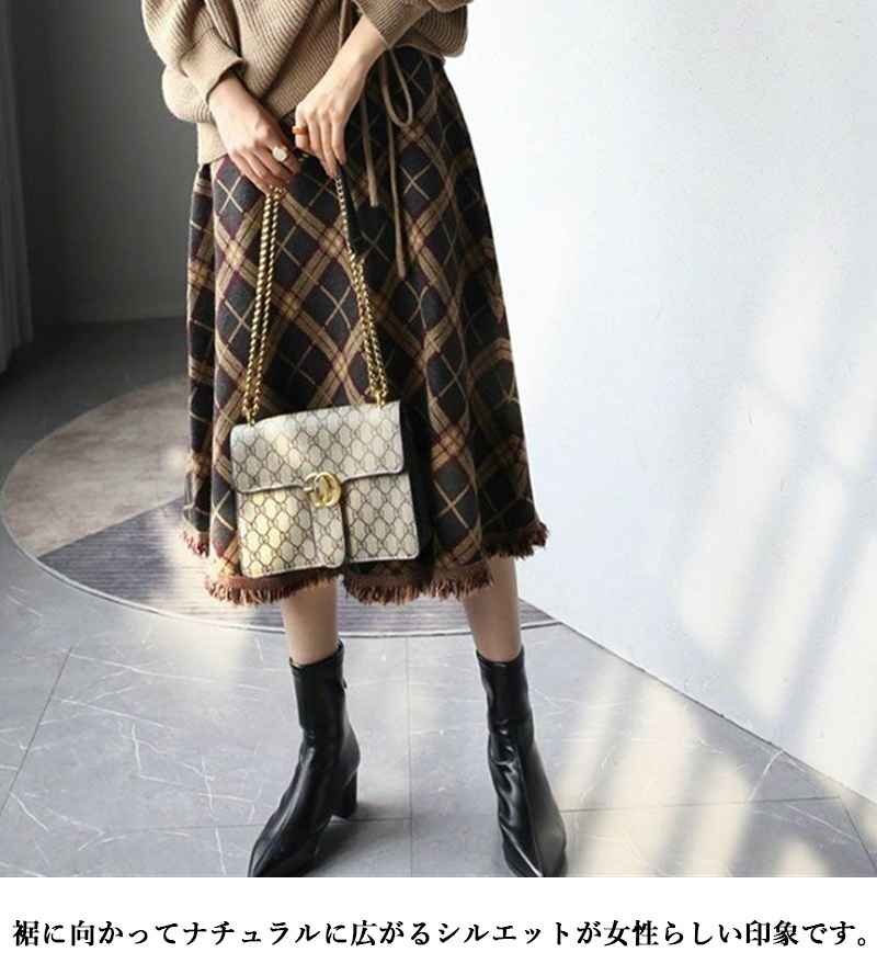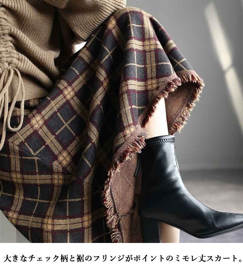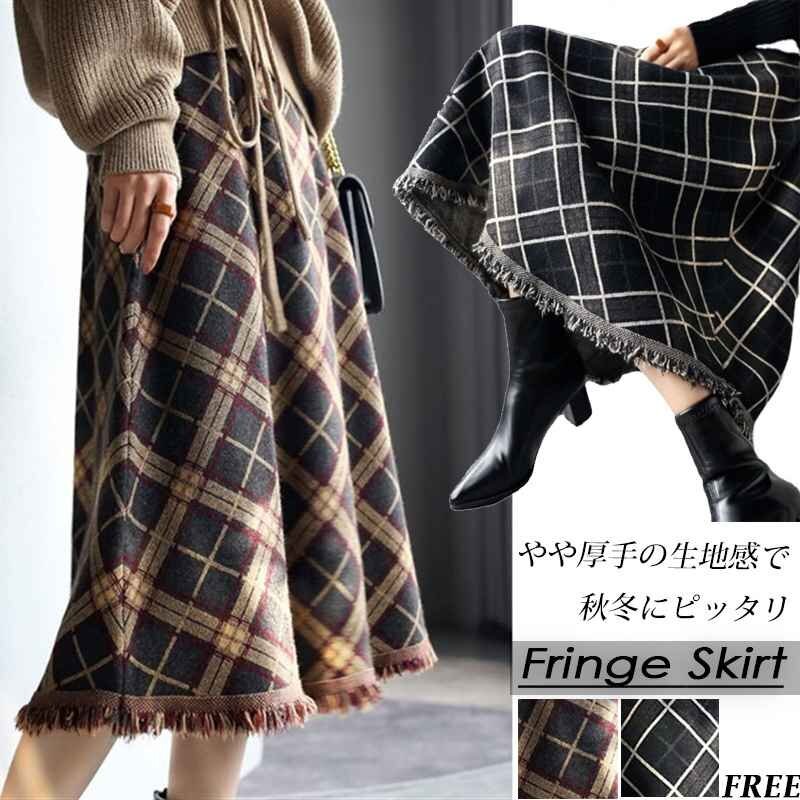 ・大きなチェック柄と裾のフリンジがポイントのミモレ丈スカート。裾に向かってナチュラルに広がるシルエットが女性らしい印象です。