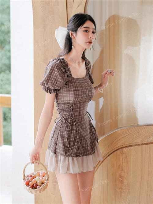 スカート水着 水着ワンピース レディース 体型カバー キレイめ 夏 おしゃれ XL チェック柄×ブラック