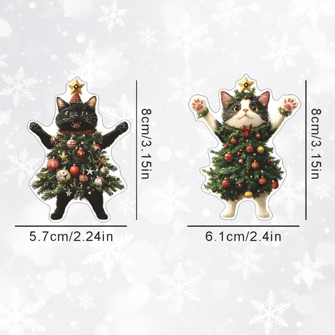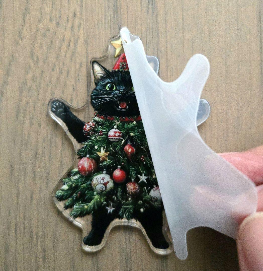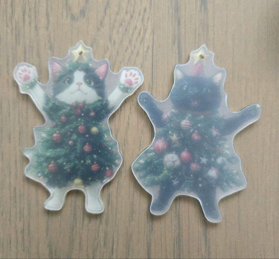 クリスマスツリーの衣装を着たかわいいネコのオーナメント2個セット、ひも付きです。 愛らしくかわいい、白と黒の2匹の猫ちゃんのX'masツリーオーナメント。 どんなテイストのツリーにも対応し、かわいく華やかに、クリスマスを楽しませてくれます。 簡単に飾ることができ、お部屋のインテリアに取り入れやすく、一気に素敵なクリスマスの雰囲気が出せます。 クリスマスツリーのオーナメントとしてだけではなく、玄関の飾りに置いたり、ドアのぶにひっかけたり、カバンに着けてキーホルダーとして使用も可能です。 いつもの飾り付けにプラスしてみませんか。 裏側に半透明の保護フィルムが貼られています。剥がすと綺麗な透明のアクリルになります。 検品のため、一度開封しています。 ゆうパケットminiにて発送させていただきます。 - セット内容: 2個セット - サイズ(黒猫): 5.7cm/2.24in - サイズ(白猫): 6.1cm/2.4in - デザイン: クリスマスツリーの衣装を着た猫のオーナメント