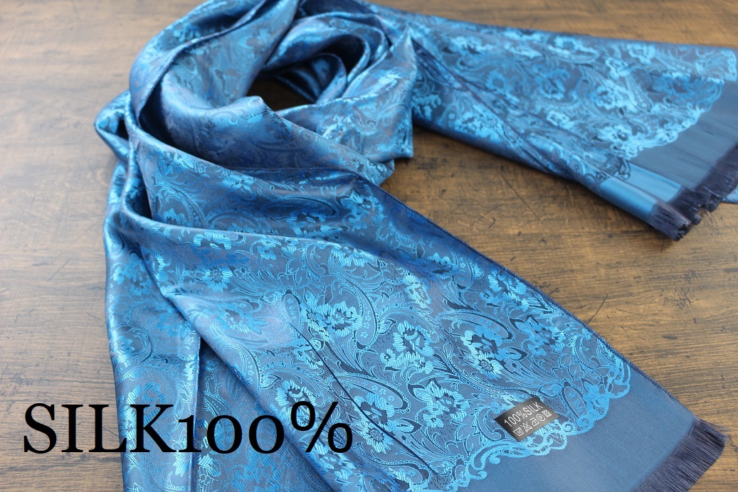 新品【シルク100% SILK】ペイズリー花柄 シャインブルー 青 S.BLUE 大判 ストール/スカーフ