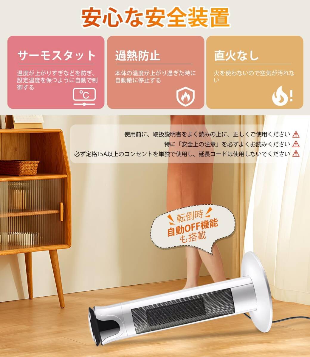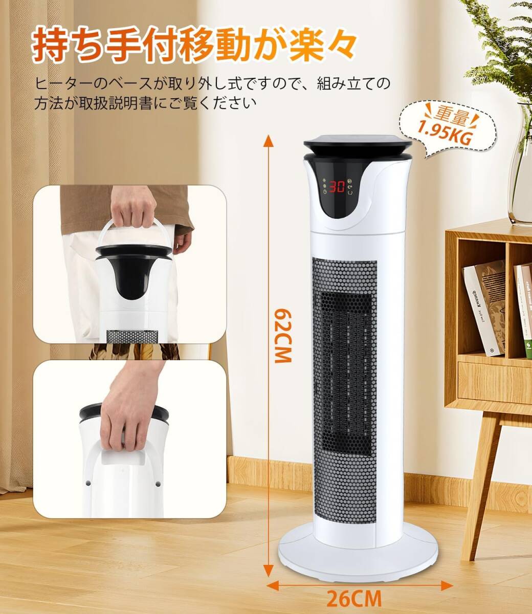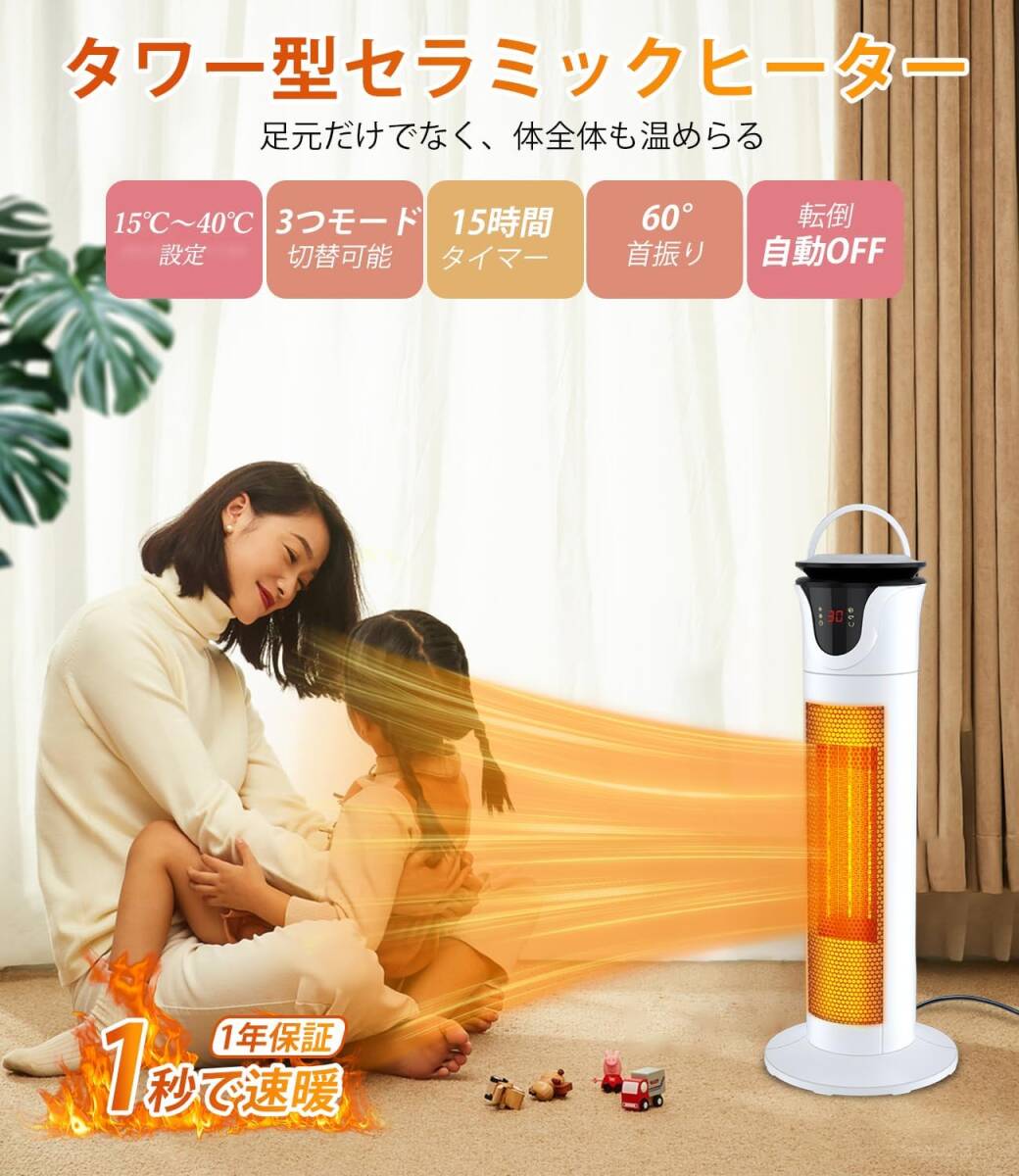 | 【1秒速暖セラミックヒーター タワー型】 操作パネルをタッチするだけ、すぐポカポカ温められ、1秒速暖で苦痛な待つ時間とはサヨナラ!高さが62cmまであるタワー型ファンヒーターなので、縦長な送風口から温風を出して、椅子に座った状態で足元だけでなく、膝までも温められます。さらにタワー型で場所も取らず、リビングやキッチン、脱衣所、トイレなどのさまざまなシーンで活躍することができます。 【3段階モード 恒温機能】 本パワフルセラミックファンヒーターは、シーンに合わせて、強温風モード・弱温風モード・送風モードから切り替え可能。瞬間速暖したいときに、パワフル強温風モードがおすすめ、長時間使用したい場合に省エネ 電気代安いために、弱温風モードに切り替えるのがおすす、さらに、送風機能も搭載、扇風機代わリやお部屋の換気にも役たち、夏冬兼用で1年中使用することができます 。ご注意:※強弱の切り替えは発熱量を切り替えるもので、温風の風量は同じです。 【転倒OFF 多重安全機能】 本セラミックファンヒーターを使用するときに、必ず定格15A以上のコンセントを単独で使用し、延長コードは使用しないでください。セラミックヒーター タワーに転倒自動オフ機能搭載、電気ストーブが倒れたり傾いたりしたときに自動的にオフになり、安定した場所に置いてから、電源ボタンを押すと電源が入ります。過熱防止機能搭載、温度が65℃上回ると、自動的に電源オフになります。100%直火なしの為安心して暖かさを楽しむことができます。日本国内電気用品安全法(PSE)認証済です。安全・安心・安定・快適・満足な暮らしを楽しめます。 【パッケージ内容 】 ご注意:このセラミックヒーターは電気で加熱した温風を送り出しますので、部屋を部分的にあたためる暖房器具で、部屋全体を温めることができません。予めご了承ください。パッケージ内容は電気ヒーター本体*1、ベース*1、ネジ数個*1、ねじ回し*1、リモコン*1、日本語取扱説明書*1。ヒーターのベースが取り外し式ですので、組み立ての方法がぜひ取扱説明書にご覧ください。サイズ:幅26×奥行26×高さ62cm、重さ:1.95kgで、 電源:AC100V(50/60Hz)、消費電力:1200W、電源コード:約1.35cm。L162 |