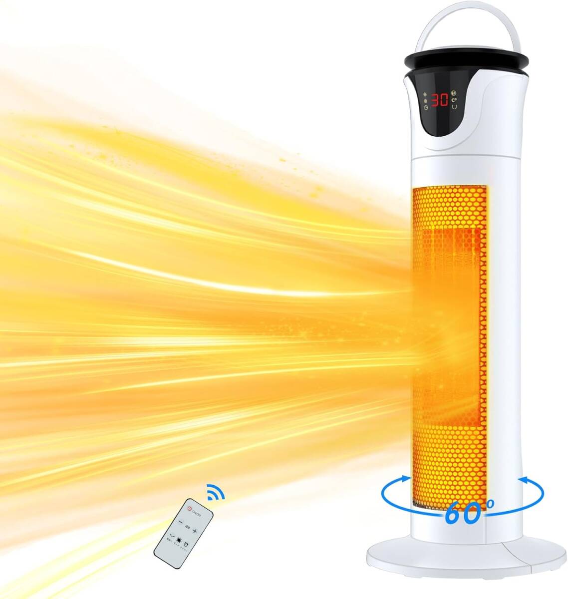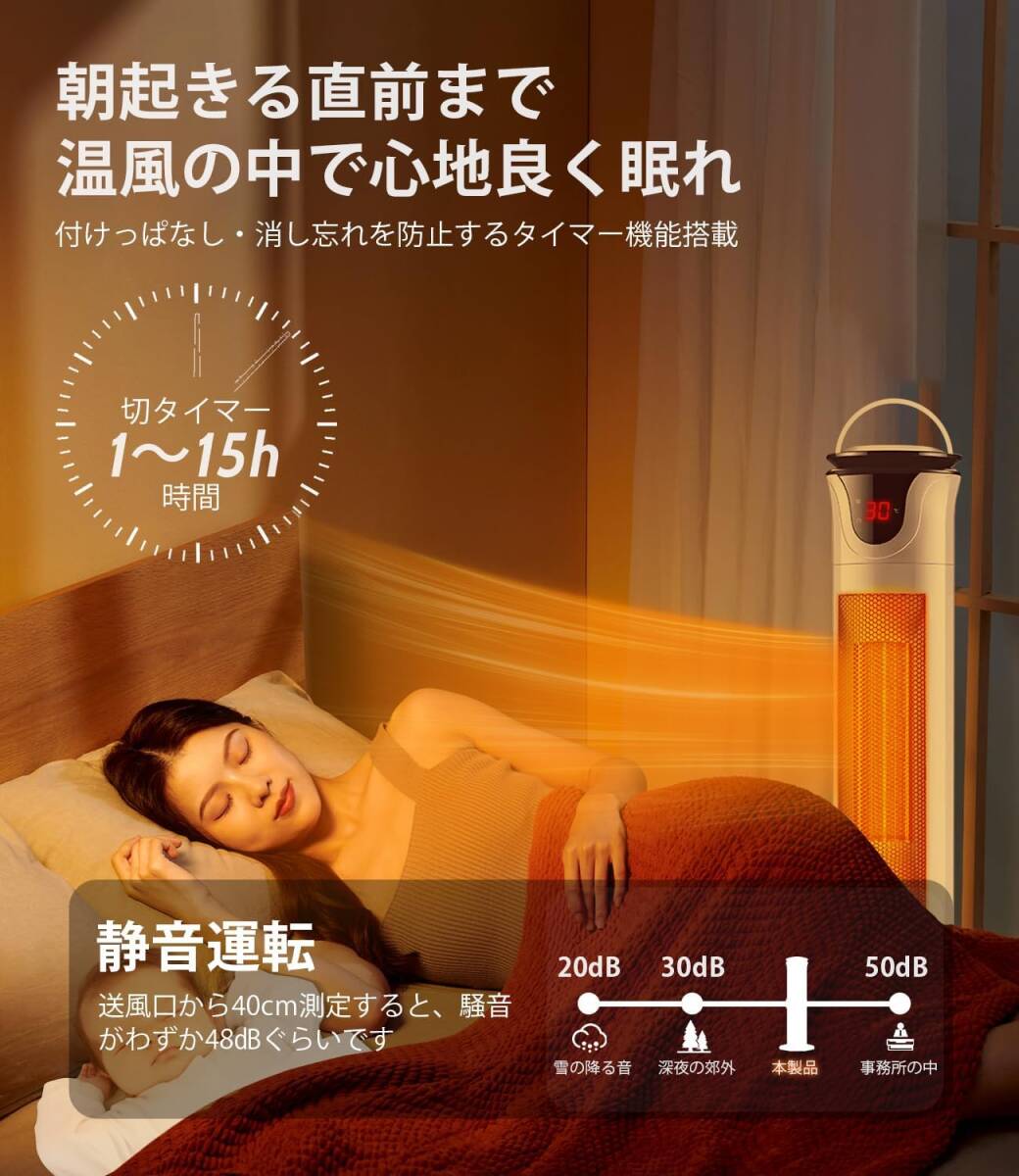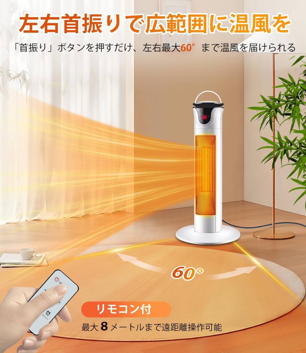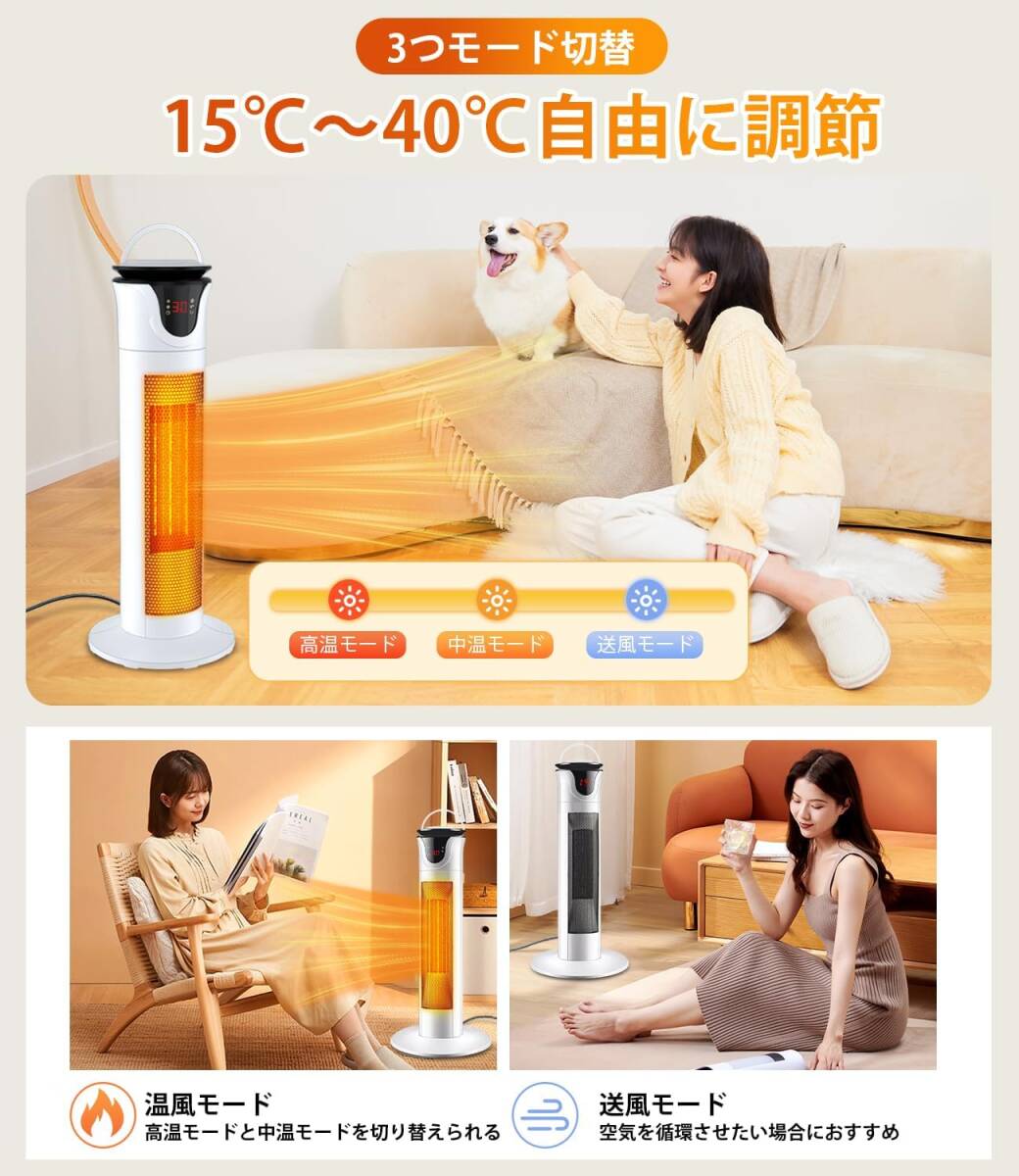 | 【1秒速暖セラミックヒーター タワー型】 操作パネルをタッチするだけ、すぐポカポカ温められ、1秒速暖で苦痛な待つ時間とはサヨナラ!高さが62cmまであるタワー型ファンヒーターなので、縦長な送風口から温風を出して、椅子に座った状態で足元だけでなく、膝までも温められます。さらにタワー型で場所も取らず、リビングやキッチン、脱衣所、トイレなどのさまざまなシーンで活躍することができます。 【3段階モード 恒温機能】 本パワフルセラミックファンヒーターは、シーンに合わせて、強温風モード・弱温風モード・送風モードから切り替え可能。瞬間速暖したいときに、パワフル強温風モードがおすすめ、長時間使用したい場合に省エネ 電気代安いために、弱温風モードに切り替えるのがおすす、さらに、送風機能も搭載、扇風機代わリやお部屋の換気にも役たち、夏冬兼用で1年中使用することができます 。ご注意:※強弱の切り替えは発熱量を切り替えるもので、温風の風量は同じです。 【転倒OFF 多重安全機能】 本セラミックファンヒーターを使用するときに、必ず定格15A以上のコンセントを単独で使用し、延長コードは使用しないでください。セラミックヒーター タワーに転倒自動オフ機能搭載、電気ストーブが倒れたり傾いたりしたときに自動的にオフになり、安定した場所に置いてから、電源ボタンを押すと電源が入ります。過熱防止機能搭載、温度が65℃上回ると、自動的に電源オフになります。100%直火なしの為安心して暖かさを楽しむことができます。日本国内電気用品安全法(PSE)認証済です。安全・安心・安定・快適・満足な暮らしを楽しめます。 【パッケージ内容 】 ご注意:このセラミックヒーターは電気で加熱した温風を送り出しますので、部屋を部分的にあたためる暖房器具で、部屋全体を温めることができません。予めご了承ください。パッケージ内容は電気ヒーター本体*1、ベース*1、ネジ数個*1、ねじ回し*1、リモコン*1、日本語取扱説明書*1。ヒーターのベースが取り外し式ですので、組み立ての方法がぜひ取扱説明書にご覧ください。サイズ:幅26×奥行26×高さ62cm、重さ:1.95kgで、 電源:AC100V(50/60Hz)、消費電力:1200W、電源コード:約1.35cm。L162 |