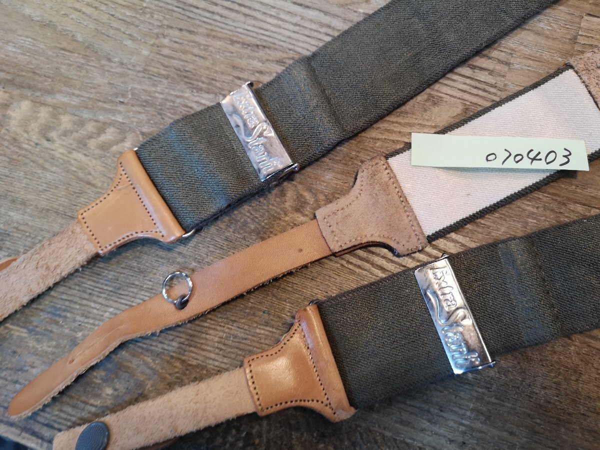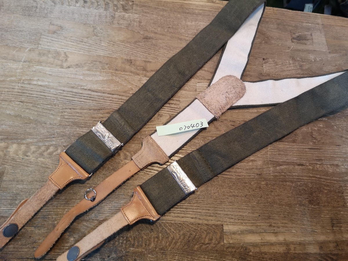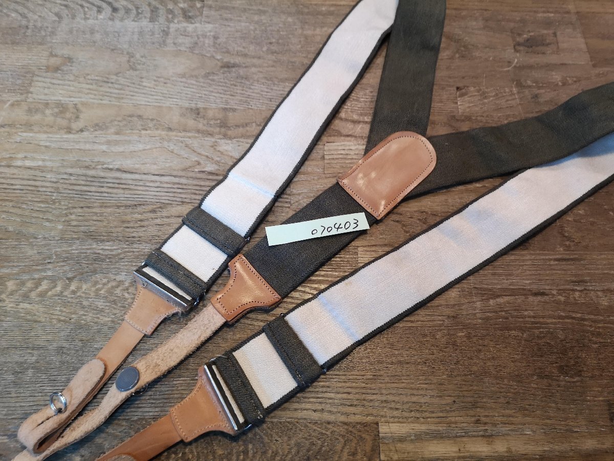 1枚目の写真は流用です。若干のユーズドです。 東ドイツNVA放出のレザーコンビのサスペンダー、パンツ側のDリングやベルトループで固定する便利なタイプです。ベルト幅は4.5センチ程度、ラバーサスペンダーですので伸びますが最長サイズは静止状態でボタンホールの間が110センチ程度、伸ばせば120~130センチ前後程度で基本的に男性用サイズです。 クロネコネコポス便200円でお送りいたします、落札価格にプラスでお願いいたします。服飾小物 。