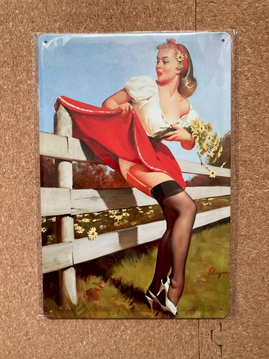 ピンナップガール ビンテージ スカート 赤 自然 空 花 美女 レトロ ブリキ看板 メタルサインプレート アメリカン雑貨 ウォールデコ