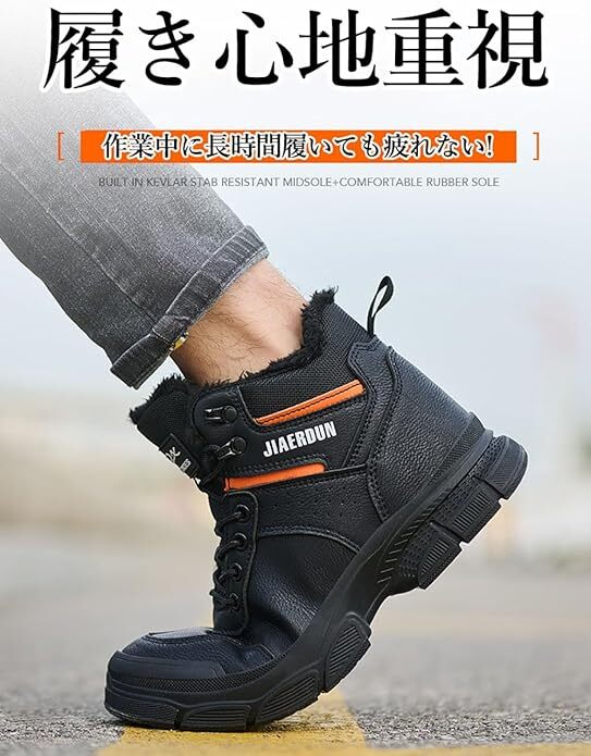 【安全性能】軽量樹脂製の先芯がつま先を衝撃から守り、ケブラー中底が釘やガラスなど鋭利物の踏み抜きを防止します。過酷な作業現場での安全性を確保します。