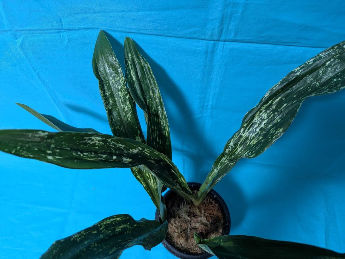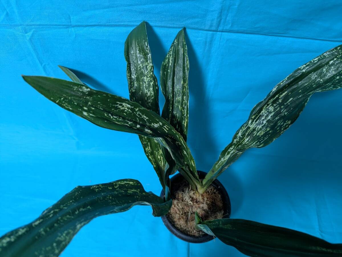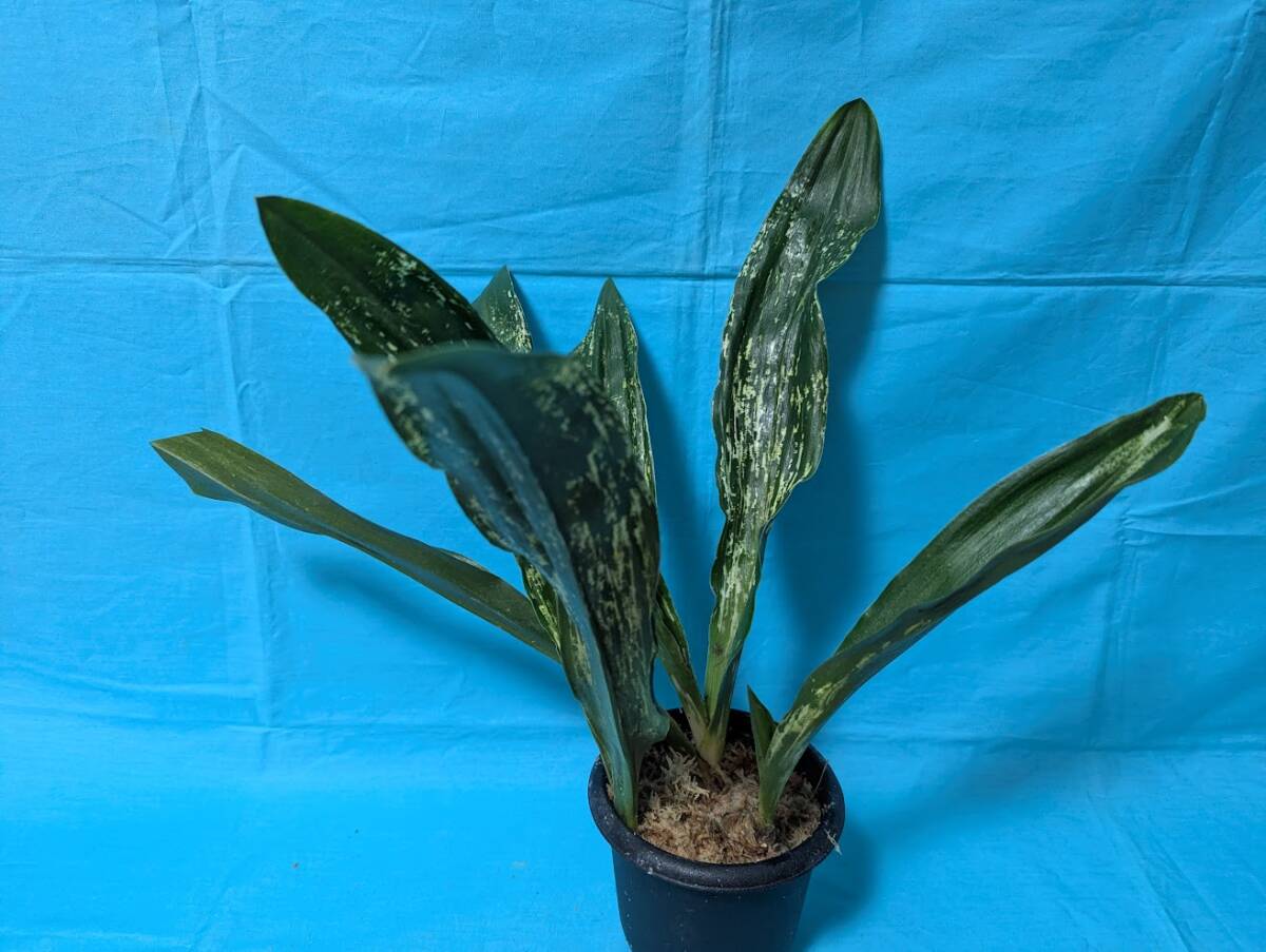 幅広の葉で先が丸をおび、白い図が葉全体に入るほど人気の高い品種です。
