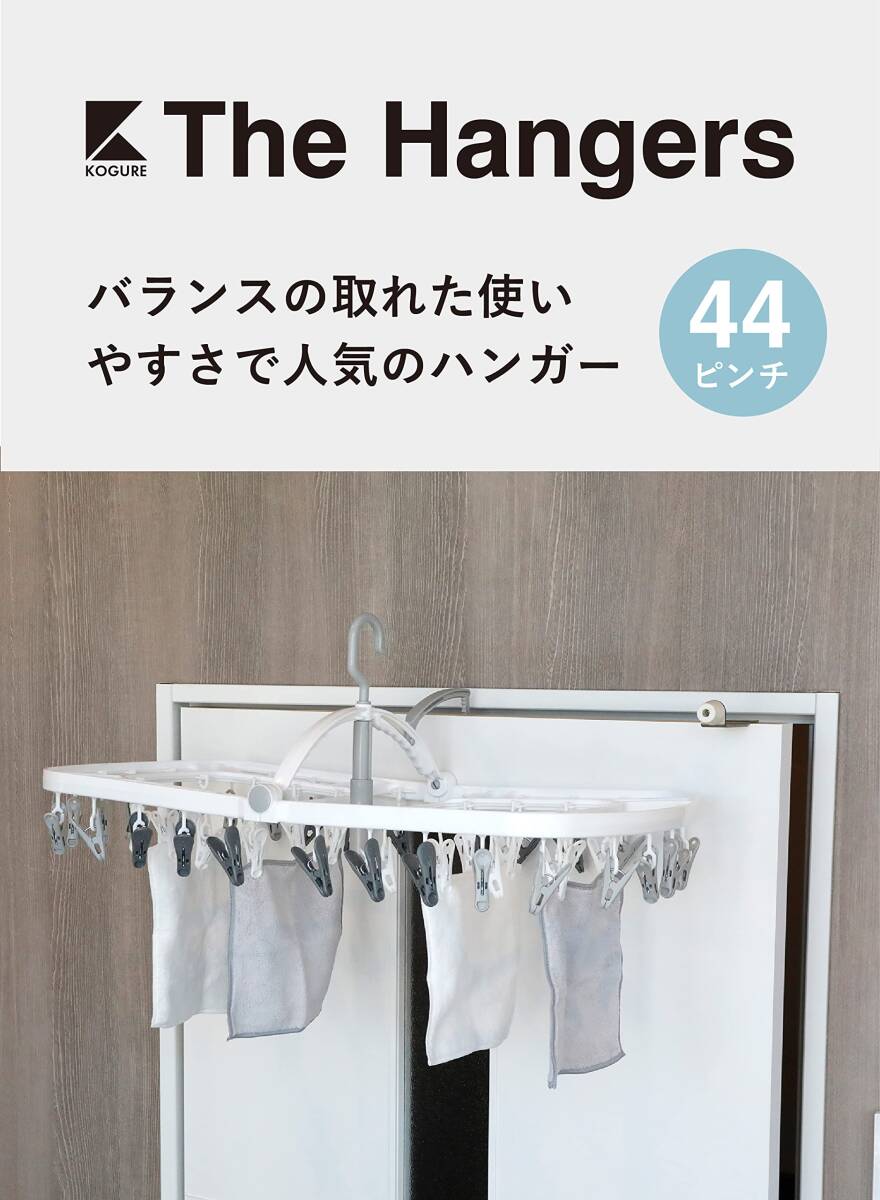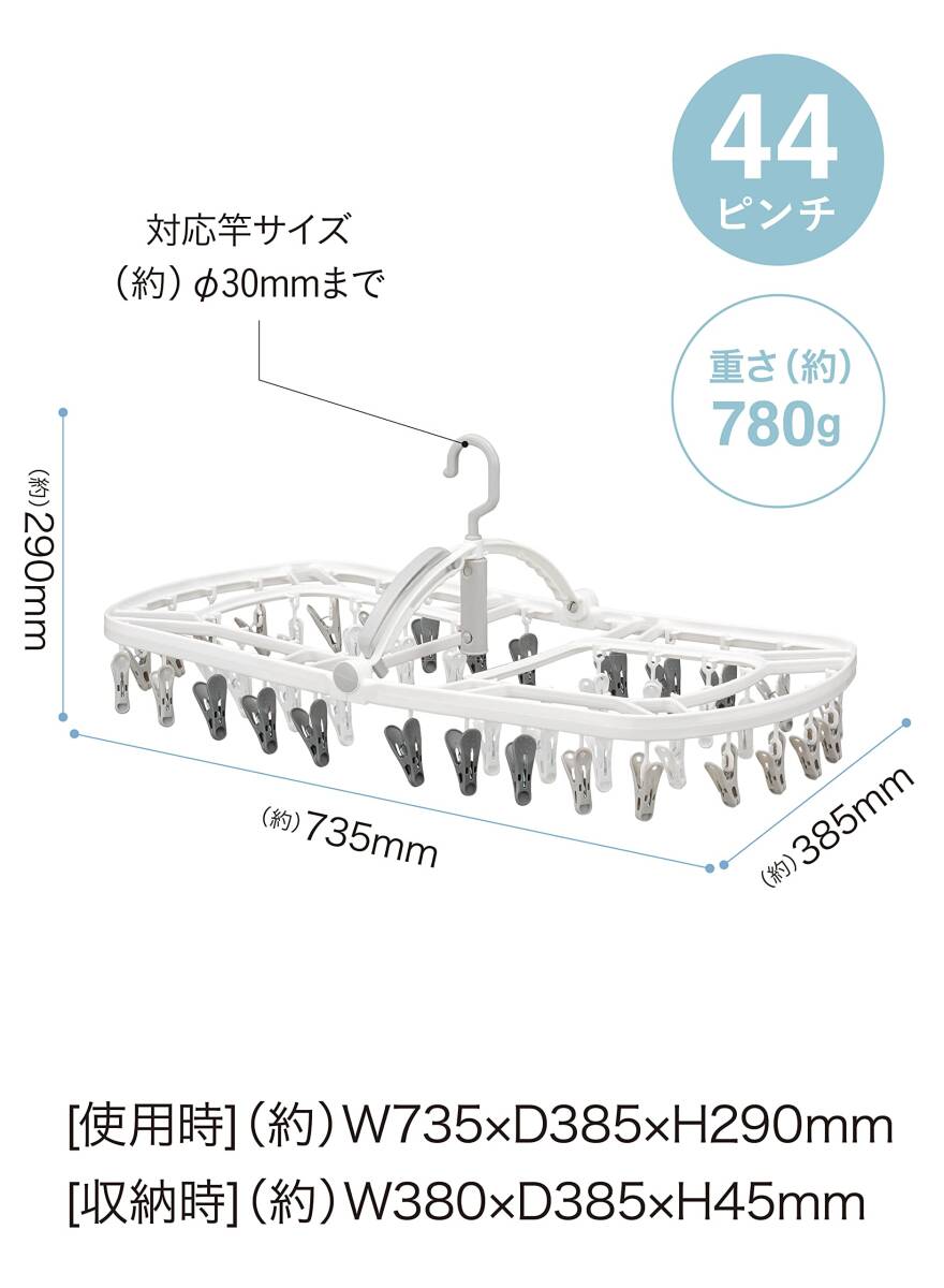 ・小さすぎずにまとめ干しにもちょうどいい「ランドリーハンガー44ピンチ」ドアなどに引っ掛けられる部屋干しフックが付いているので、日中外出が多い方にもぴったりです。