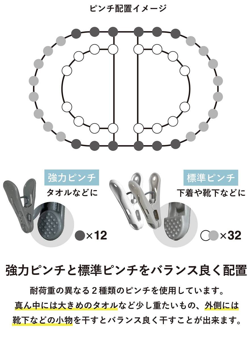 ・標準ピンチ(ホワイト、ライトグレー)、強力ピンチ(ダークグレー)の2種類のピンチがついています。強力ピンチは挟む面が少し広めになっている分、標準ピンチに比べてつかむ力が強いピンチです。タオルなど少し大きめの洗濯物を干すのに便利です。