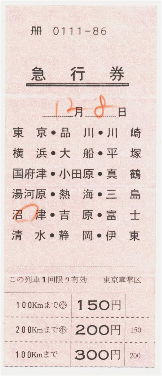 国鉄 東京車掌区乗務員発行 車内急行券 沼津から 100kmまで です。