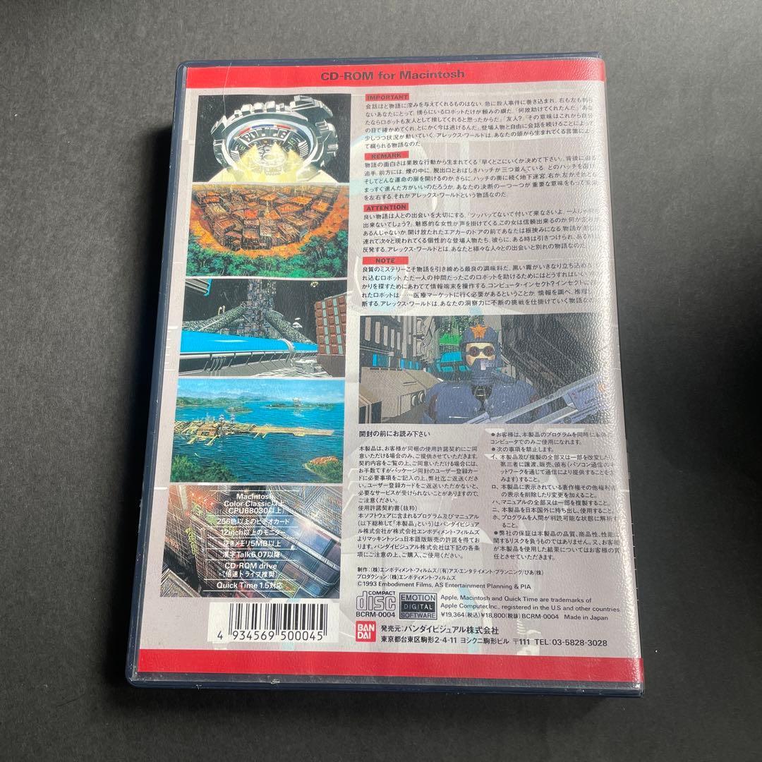93年バンダイから発売されたレアゲーAleX-World かなりのレアゲームです。 一見洋ゲー感がありますが日本企画になり 製作はエンボディメント・フィルムズ アングラ雑誌ペヨトル工房などを発行していた会社かと思われます また過去にゼイラム2 などの製作に携わった様です。 声優に 五十嵐麗 クーロンズゲート(ハニー・レディ) 愛河里花子 クーロンズゲート(紅頭3号) と後にクーロンズゲートの声優を務めることになるなどカルトゲームファンにとっては嬉しいメンツです。 各関係者のWikipediaにもなければYouTubeでもほぼ動画が上がってないのでかなり貴重なゲームです。 おそらく市場にあがってるのは現状はこちらのみではないかと思われます。 古いものなので動作環境は不確かです。 Macintosh対応 ケースに傷汚れ ディスクに古傷があるものとお考えください