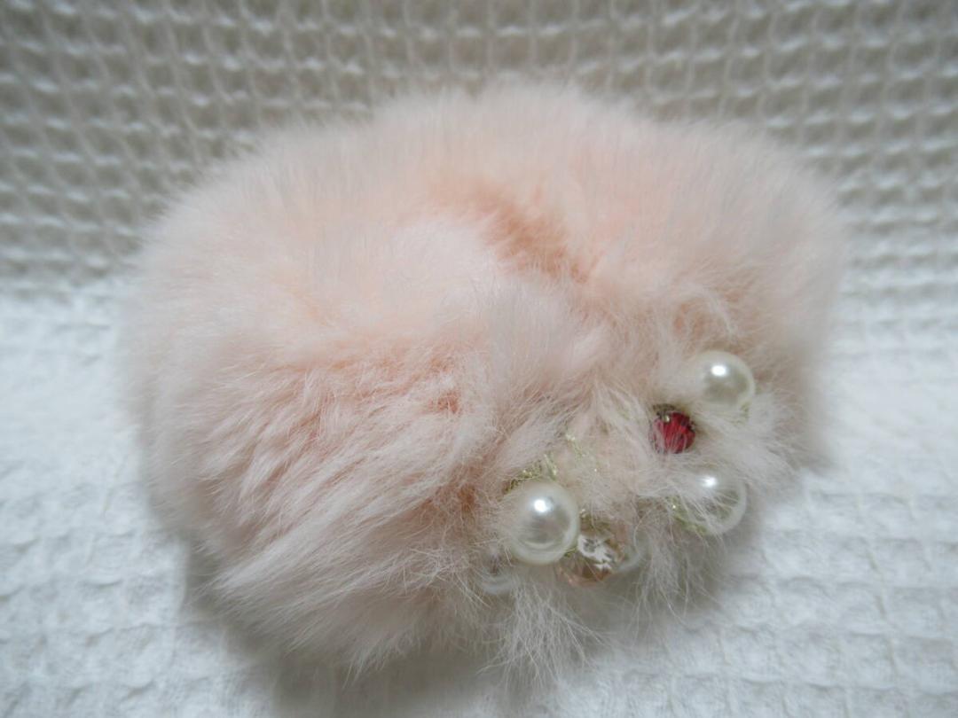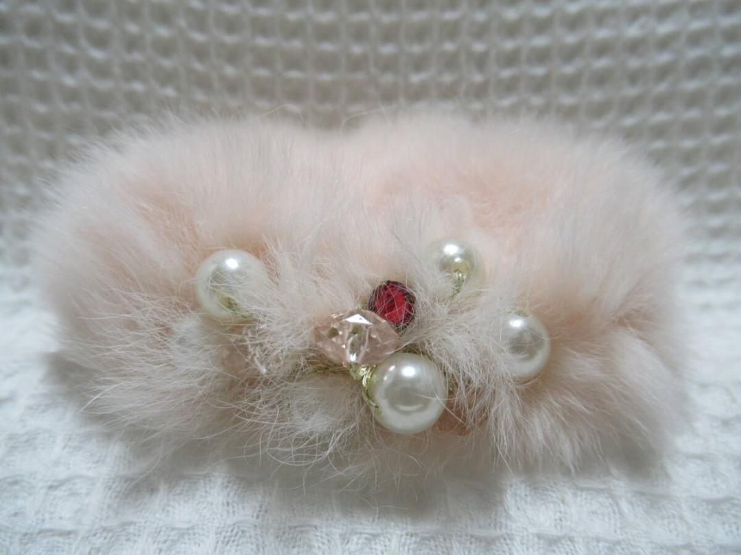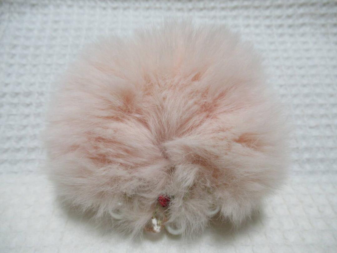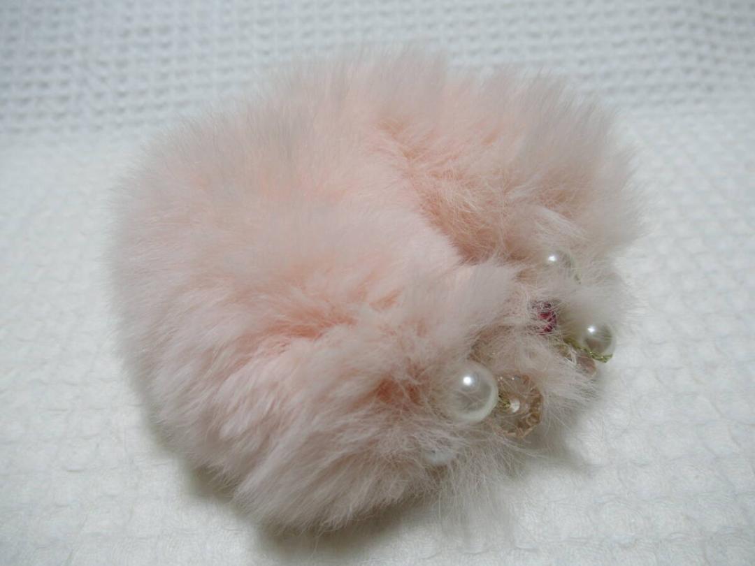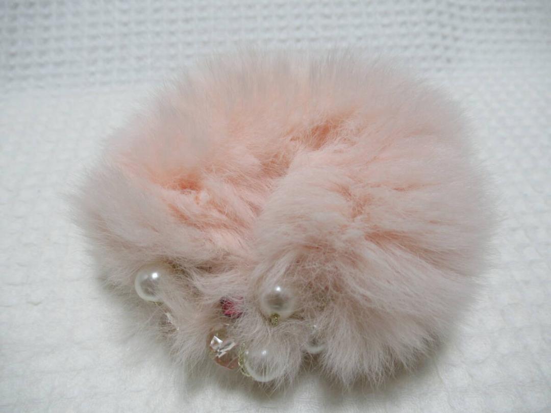 パール・クリア系(ピンク・レッド)系色のビジュー付き ライトピンク系色フェイクファーシュシュ
