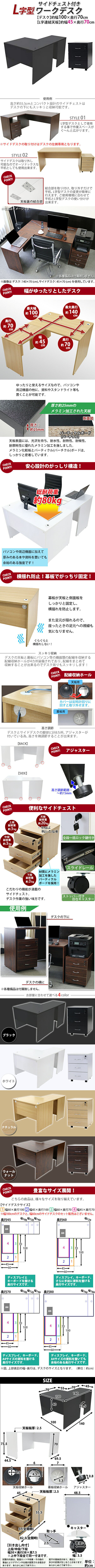 | 商品サイズ | ■本体寸法・・・L字型デスク:W約100×D約140×H約73.5(cm) サイドチェスト:W約40×D約48.5×H約55.5(cm) ■梱包寸法(3個口)・・・デスク:W約110×D約80×H約12(cm) サイドデスク:W約54×D約78×H約12(cm) サイドチェスト:W約47×D約56×H約52(cm) |