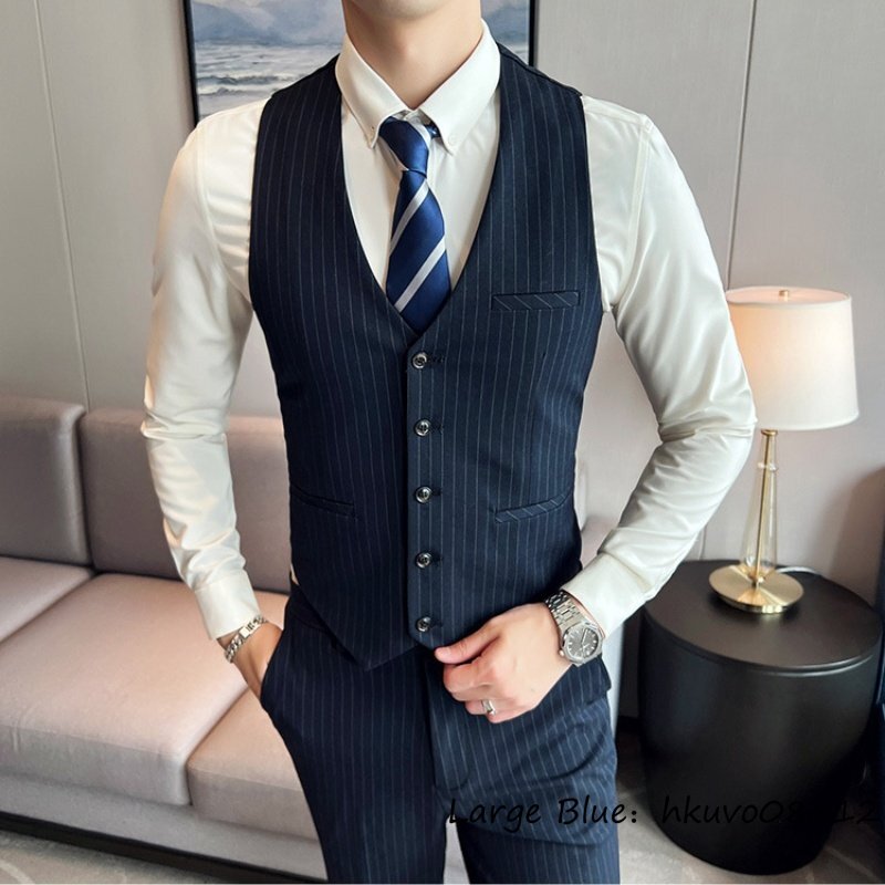 極美新品♪スリーピース メンズ ストライプ柄 スーツセット 3点セット シングルスーツス タイリッシュ 結婚式 二つボタン ネイビー 4XL