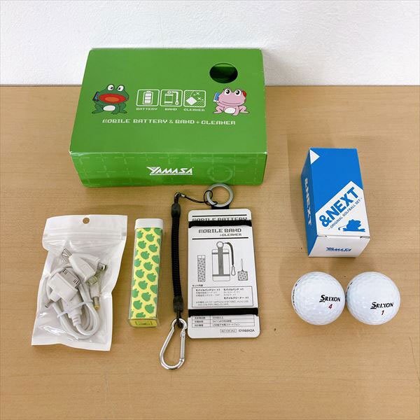 | 未使用品 ※画像にあるものが全てです。内容は画像をご覧ください。 ※クリーナーはありません。 未使用品ですが、モバイルバッテリーでスマホが充電出来ることを確認しました。 保管品につき、バッテリーの寿命は分かりかねます。 モバイルバンドの樹脂が若干白くなっている部分があります。 ゴルフボールは綺麗です。 元箱は2点とも、小キズや擦れ等見られます。 現状での出品とさせていただきます。 ノークレーム、ノーリターンでお願いします。 モバイルバッテリー仕様