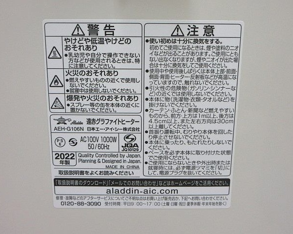 アラジン 遠赤グラファイトヒーター AEH-G106N 2022年製、中古品です。