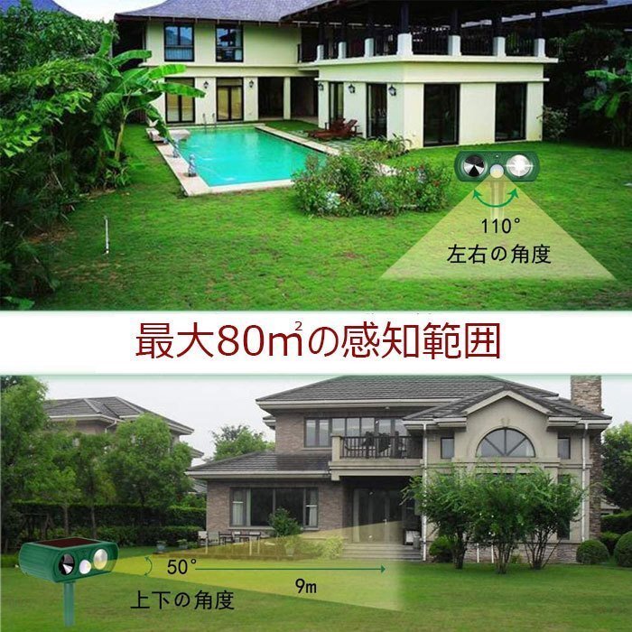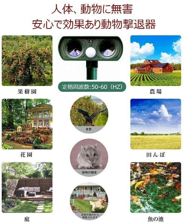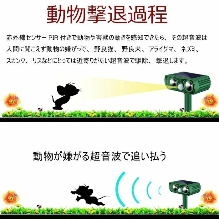 【人体動物環境に無害】:超音波退治機能により、化学物質を使用せずに猫 、犬、ネズミ 鳥、 蛇などの害獣を傷つけずに撃退できます。ガーデン、花壇、お家の周り、愛車のそばに置いて動物の糞尿、食害、騒音、足跡などの悩みから解放してくれる。。超音波センサーのため、少し音が聞こえます。人と動物に無害ですが、室外に置いた方をおすすめいたします。
