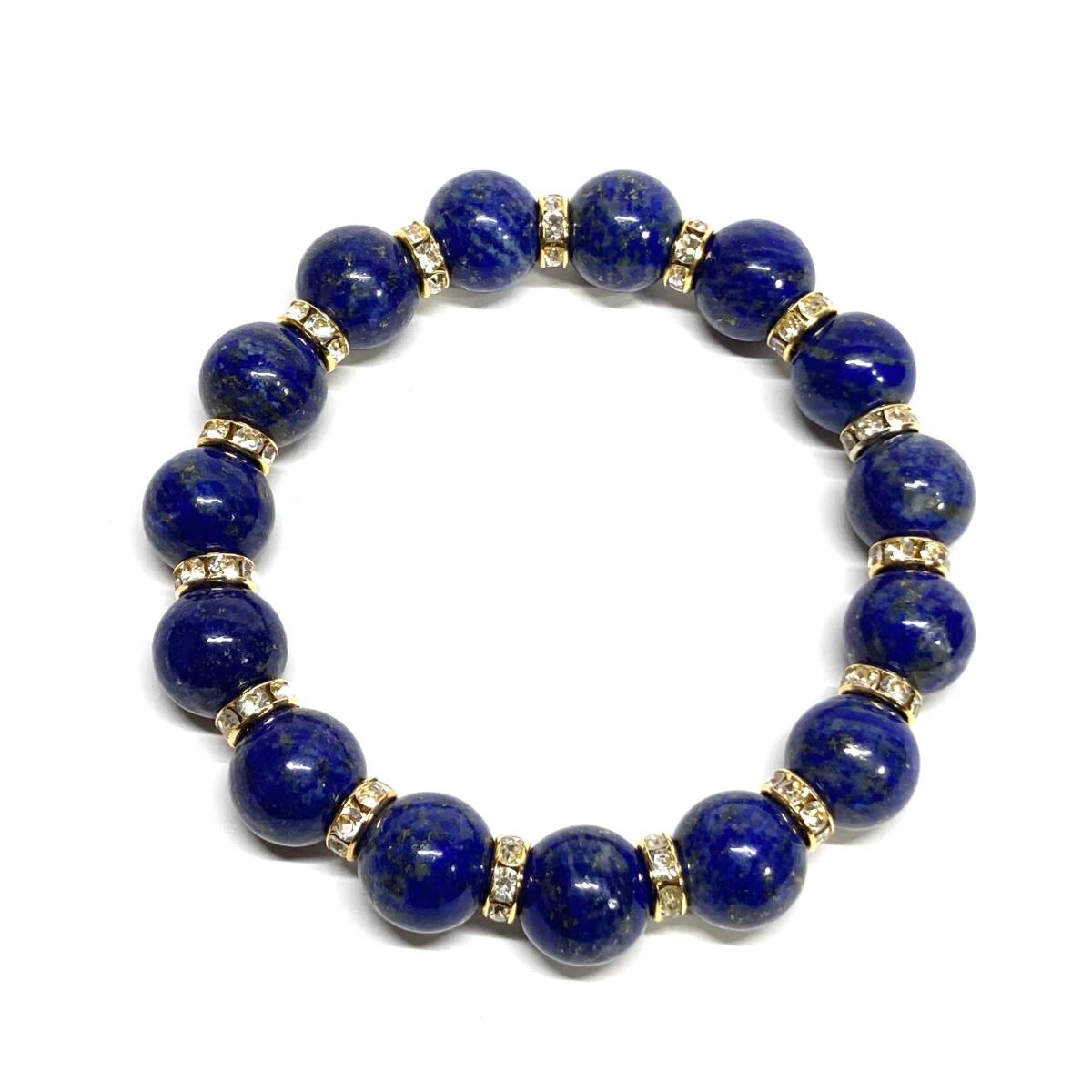 こちらは、12mm玉のラピスラズリを使用したブレスレットです。石との間にはロンデルを挟み高級感を演出しています。シンプルなデザインですのでどんなコーディネートとも合わせ易いブレスレットです。石大きさは12mm玉です。内周約18cmです。(サイズ変更の場合は取引ナビにてご連絡をお願いします。) 数に限りがございますので気になる方はお早めにどうぞ。