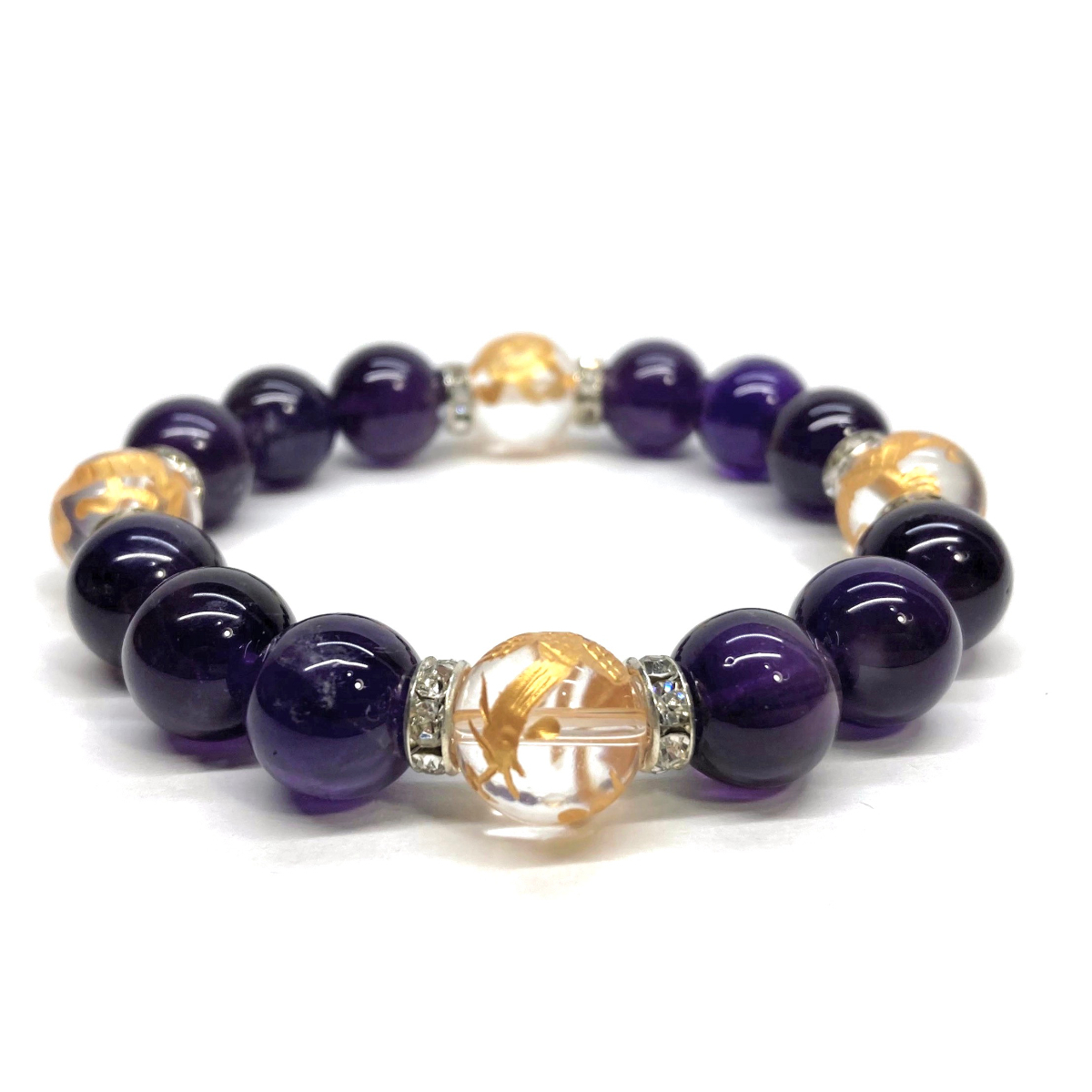 四神獣金彫水晶×アメジスト 12mm パワーストーン ブレスレット天然石 青龍 白虎 玄武 朱雀 運気上昇 お守り 金運 四神獸 四神相応 S