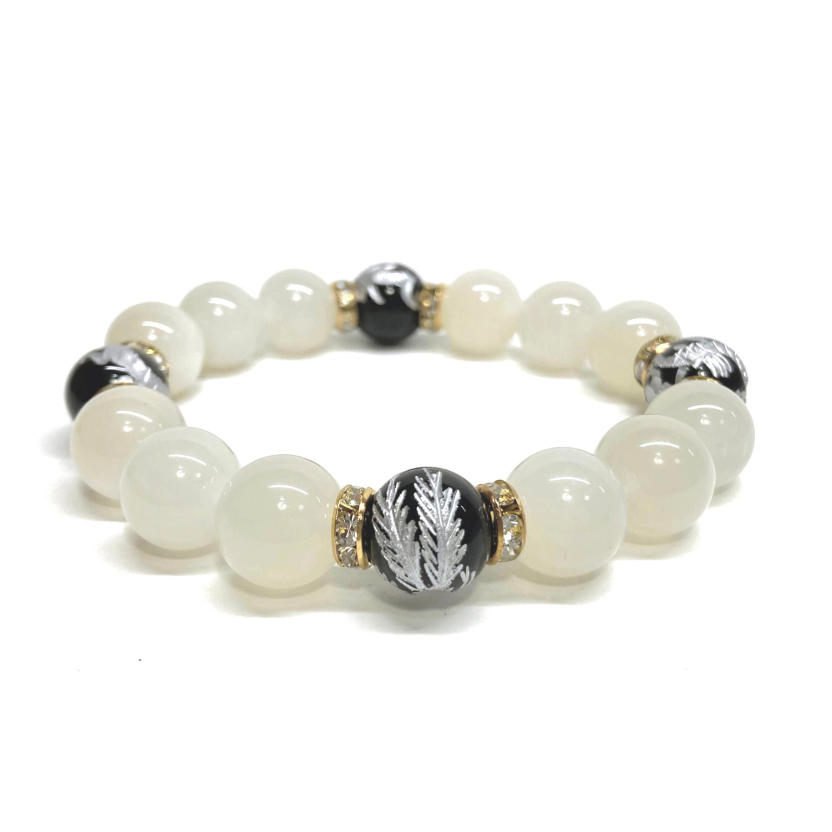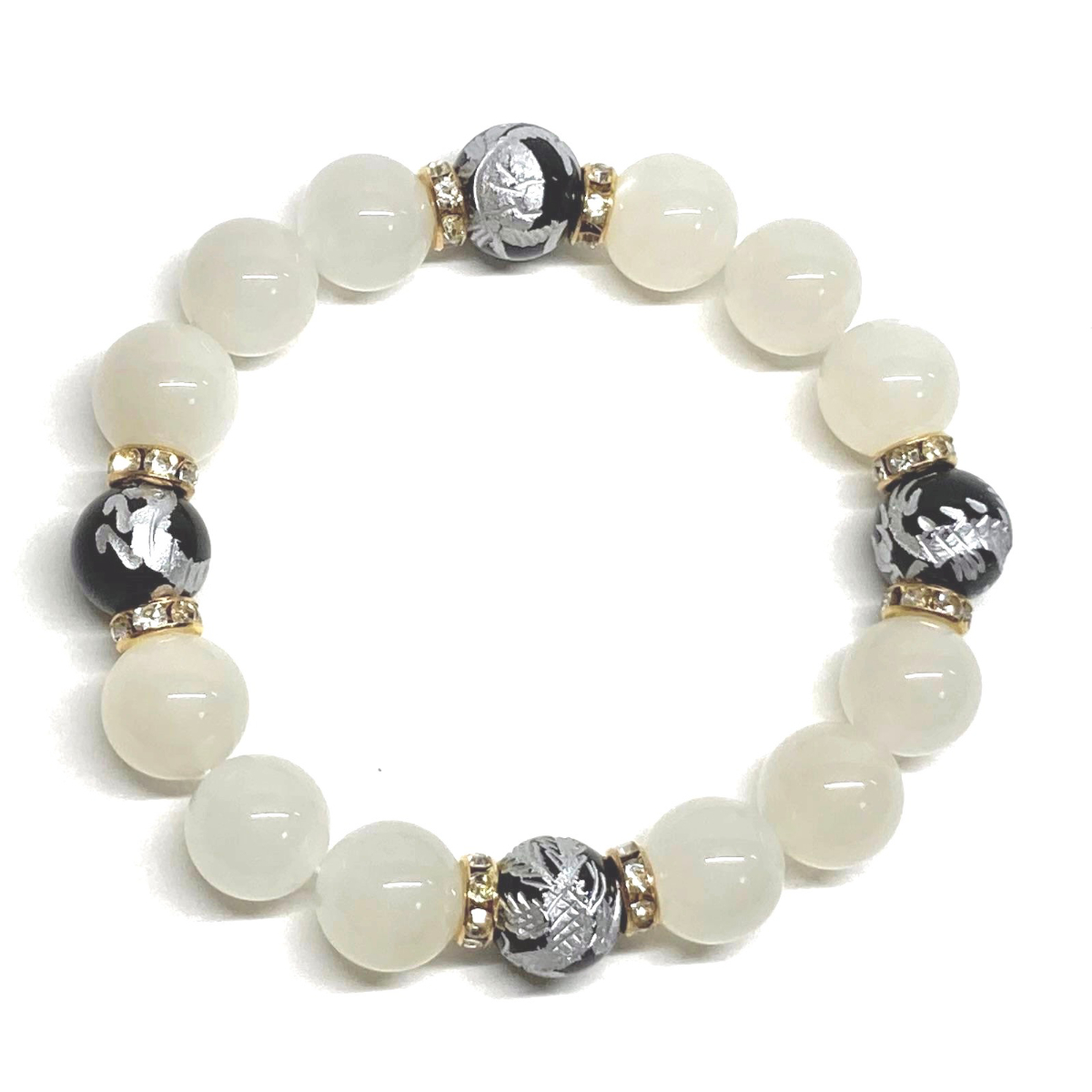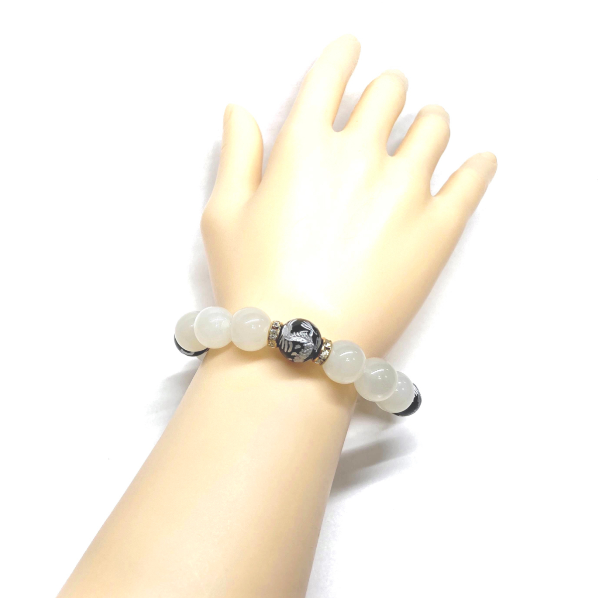 こちらは、四神獣銀彫オニキとムーンストーンを組み合わせたパワーストーンブレスレットです。四神獣は、中国の伝説で4つの方向(東西南北)を守護する神聖な神。四神獣、厄災から身を守り、多くの運気を呼び込むと言われております。石大きさは程よくインパクトのある12mm玉で内周 約17cmです。 数に限りがございますので気になる方はお早めにどうぞ。
