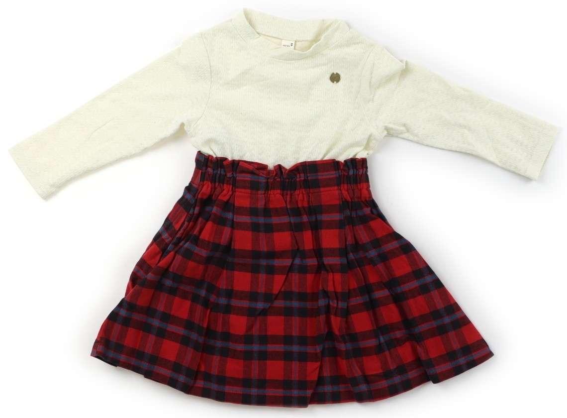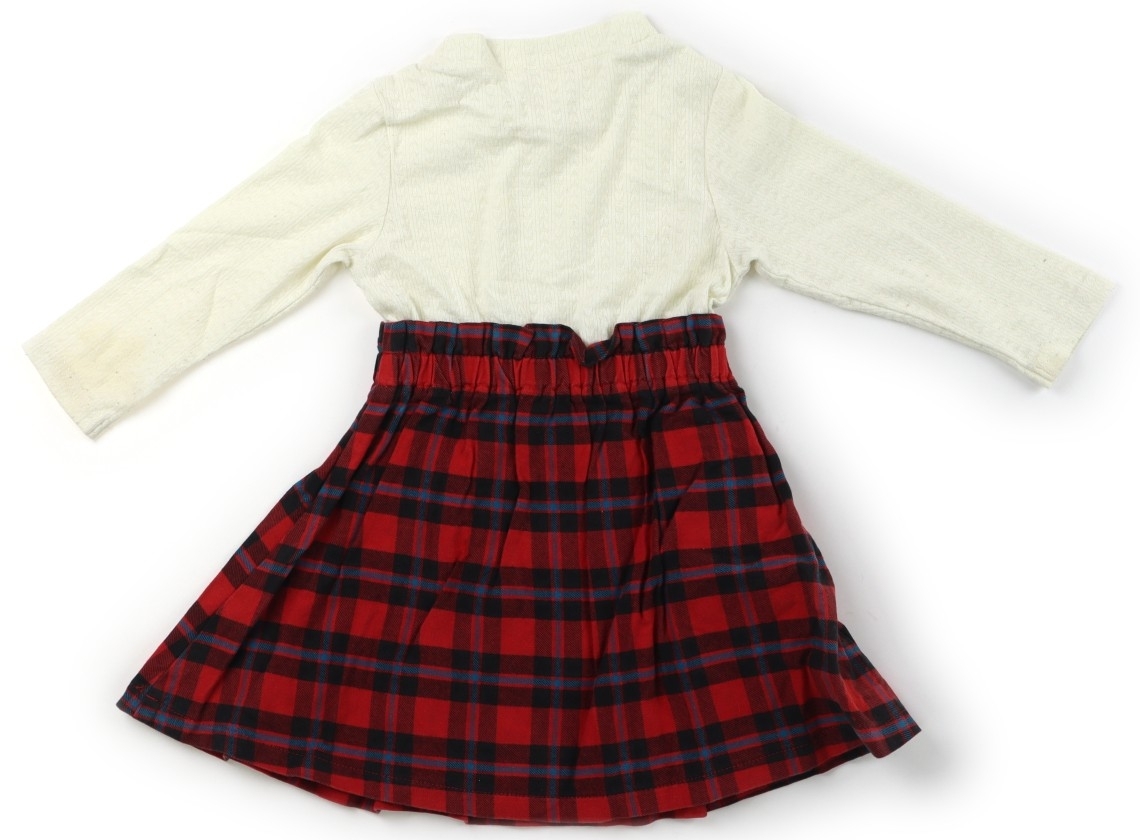上はポリエステル、コットンのニットカットソーで黒い毛玉あり。袖口が薄汚れています。スカートはコットンでポケットあり。色褪せと洗いざらし感がありますが、まだまだお使いいただけます。