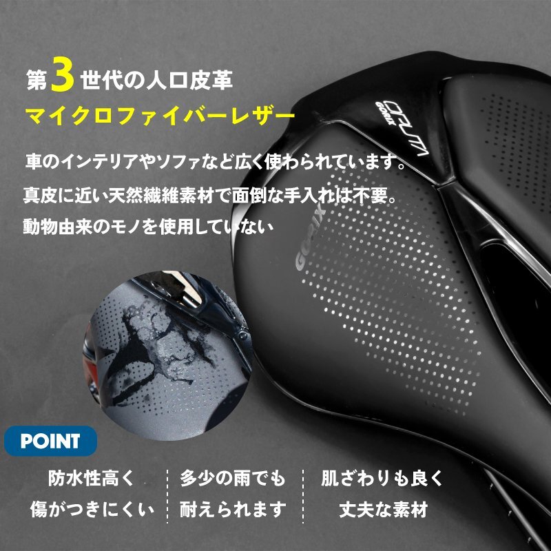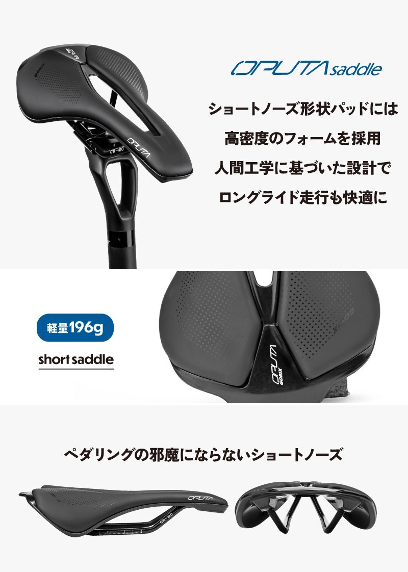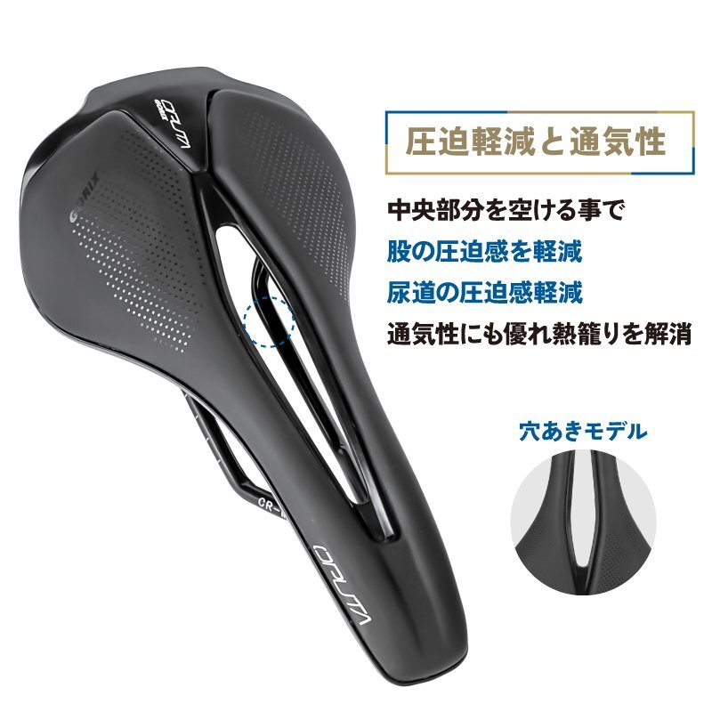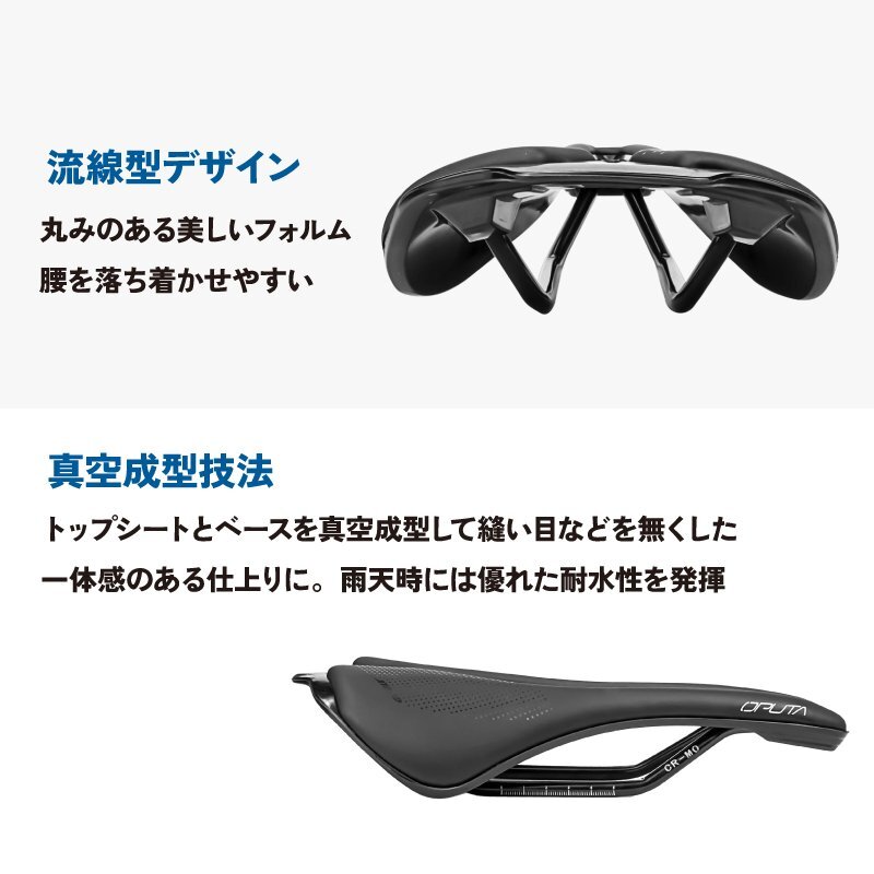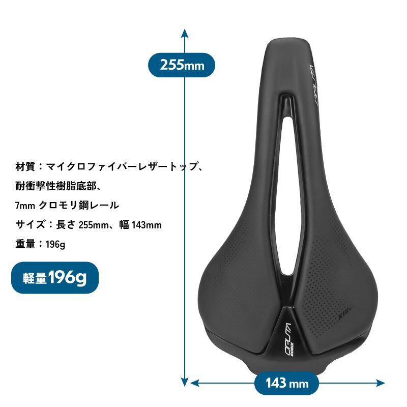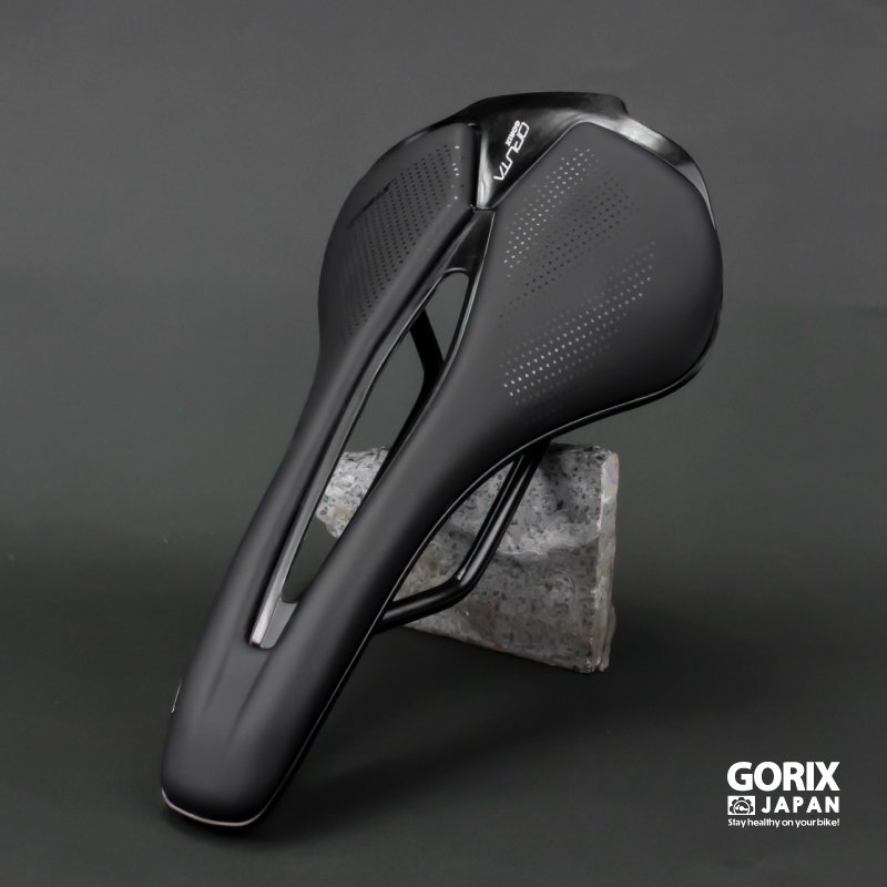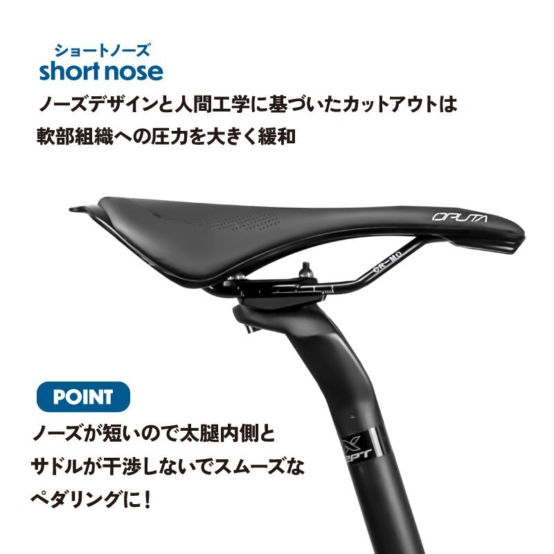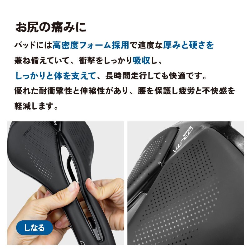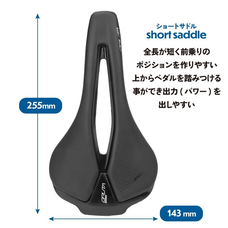 ロードバイクやクロスバイク、マウンテンバイクなどスポーツ自転車に最適なサドル ポジションが作りやすいとされるショートサドルは近年人気があります。 ショートノーズ形状で人間工学に基づいたカットアウトは軟部組織への圧力を大きく緩和ペダリングがスムーズに。 スタイリッシュでぼたつかないおしゃれなスマートデザインはどんな自転車にもマッチ。 真空成型技法でトップシートとベースを真空成型して縫い目などを無くした一体感のある仕上りに。雨天時には優れた耐水性を発揮。 マイクロファイバーレザーは扱いやすい素材となっています。 またサドル座面のパッドには高密度のフォームを採用し程よく厚みがありクッション性もあります。 [ショートサドル] 全長が短く幅が広い形状 前乗りの時、ペダリングを妨げず高速巡行も違和感なく行えます。 [ショートノーズ] 流行りのショートノーズ形状 内腿に干渉しないで脚を動かしやすいのでペダリングがスムーズに。 [穴あき形状] 中央部分をくり抜いた穴あき形状なので、股への圧迫感や尿道の圧迫感を軽減。 熱籠りも抑えて通気性もよくなっています。 [お尻の痛みに] パッドには高密度のフォームが採用で適度な厚みと硬さを兼ね備えていて、衝撃をしっかり吸収し、しっかりと体を支えて、長時間走行しても快適です。 優れた耐衝撃性と伸縮性があり、腰をしっかりと保護し疲労と不快感を軽減します。 [マイクロファイバーレザー] 第3世代の人工皮革 家具のソファなど広い分野で使わられています。 真皮に近い天然繊維素材で面等な手入れは不要。動物由来のモノを使用していない。 [防水性高い] 防水性も高く傷がつきにくい。肌触りは良く、丈夫。 多少の雨でも耐えられます。 商品内容サドル サイズ長さ255mm、幅143mm 重量196g 材質マイクロファイバーレザートップ、 耐衝撃性樹脂底部、7mmクロモリ鋼レール | |