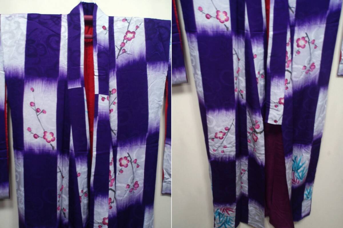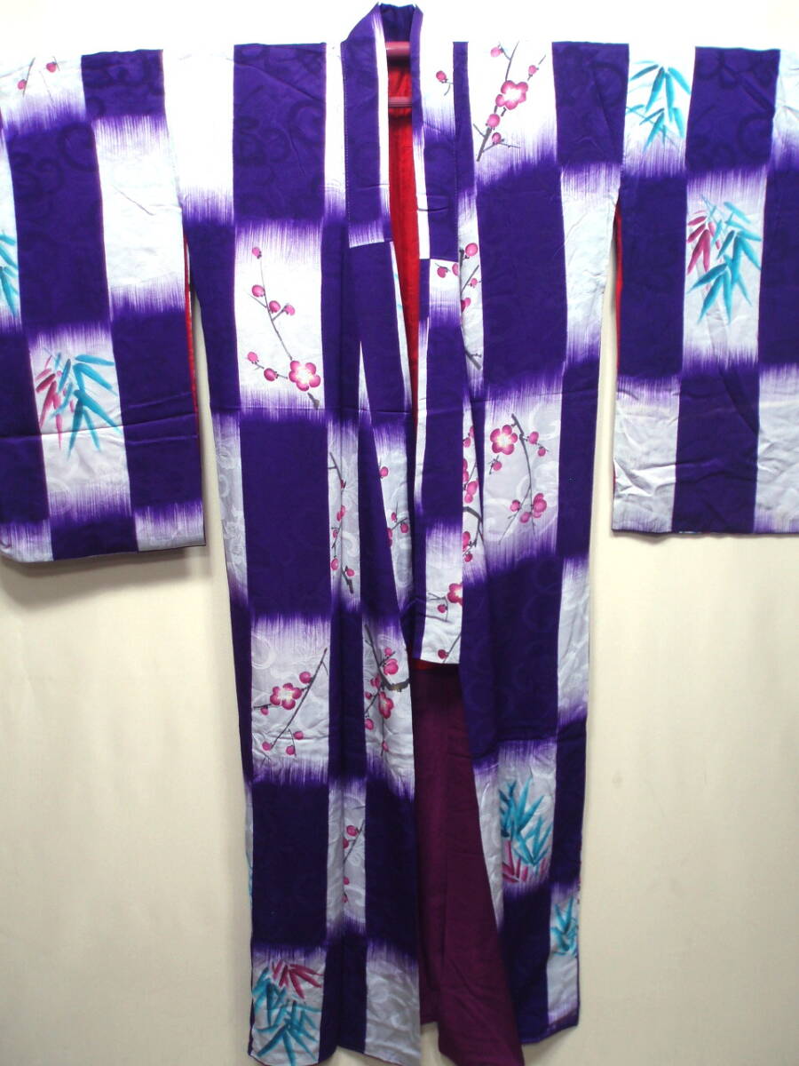 "" "L58217【生地取り用 リメイク用 古布 正絹 ちりめん 玄人柄 紫 銀鼠】古い 着物" |