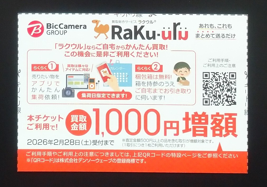 ビックカメラグループの買取サービスラクウルでの買取金額1000円増額チケットです。