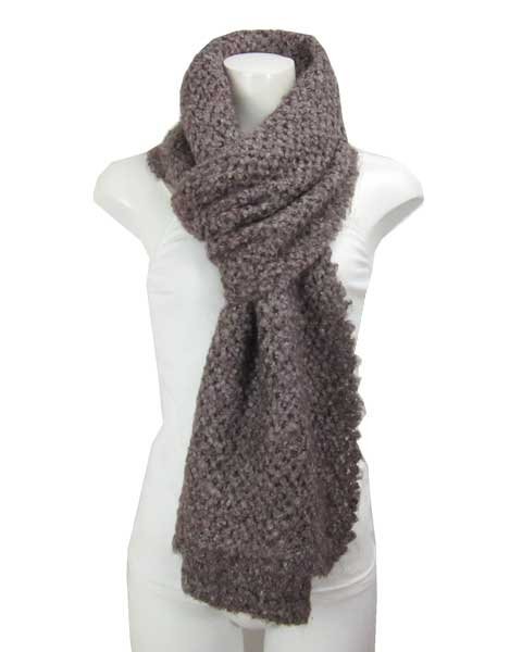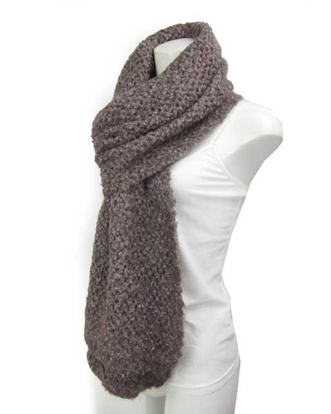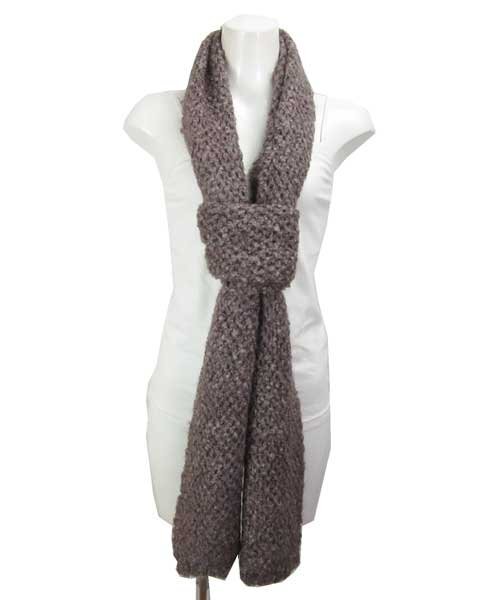 | パープルが混ざったような茶系のニットストール。伸縮性のあるざっくり編み。冬の装いのプラスワンのオシャレにや防寒としていかがでしょうか。 |
