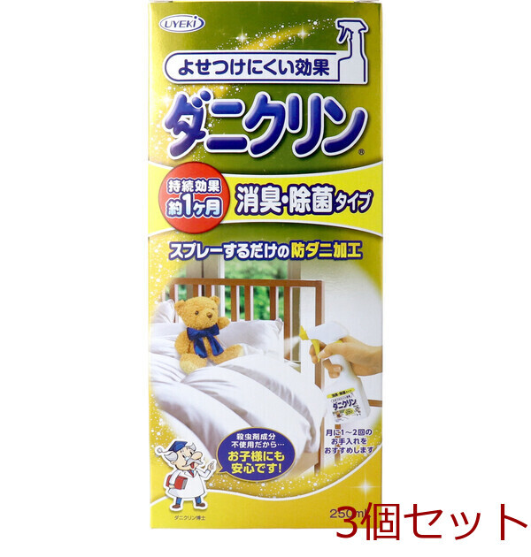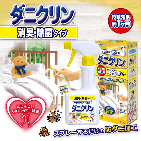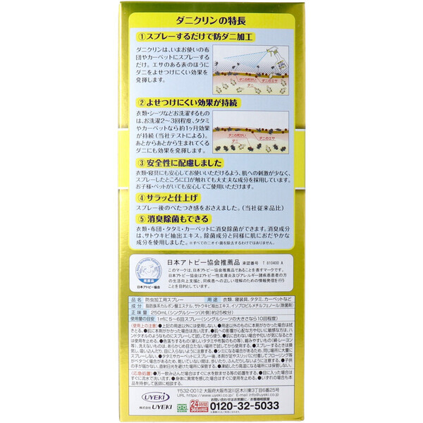 | スプレーするだけで防ダニ加工! 布団、枕、カーペット、ソファ、ぬいぐるみなどに! ・布団やタタミ、カーペットやソファーなどにシュッとスプレーするだけ。 ダニの嫌がる成分がダニをよせつけません。 ・安全性にも配慮し、寝具に使っても肌への刺激が少なく、スプレーしたところが口にふれても問題ありません。 ・シーツなどお洗濯するものは、お洗濯で2~3回程度、タタミやカーペットなら約1ヶ月効果が持続します。 ・スプレー後のべたつき感をおさえサラッと仕上げ。 個装サイズ:90X205X48mm 個装重量:約362g 内容量:250mL 製造国:日本 【発売元:UYEKI】 【有効成分】 脂肪族系カルボン酸エステル、サトウキビ抽出エキス、イソプロピルメチルフェノール(除菌剤) 【使用方法】 ・容器を軽くふり、ふたを上にあげ、約30cm離してスプレーします。 ・布団:シーツやカバー類をはずし、ゴミ、ホコリをとってからスプレーし、陰干しします。 ・カーペット・タタミ:掃除機をかけ、ゴミ、ホコリをとってからスプレーし、自然乾燥させます ※カーペットやタタミは乾くまで時間がかかります 使用量をお守りいただき、乾くまでの時間に余裕をもってご使用ください。 【使用上の注意】 ・用途以外に使用しない。 ・用途以外のものに本剤がかかった場合は拭きとる。 ・肌に本剤がかかった場合は洗い流す。 ・肌への影響が心配な方や匂いに敏感な方は、ハンドタオルのようなものにスプレーして試してから使う。 ・肌に合わない場合や匂いが気になるときは使用を止める。 ・色落ちするもの(新しいタタミや布製のもの等)、縮みやすいもの(絹・レーヨン等)、洗えないものは、あらかじめ目立たない場所で試してから使用する。 ・スプレーするときは換気し、吸い込んだり、目に入らないように注意する。 ・シミになる場合があるため、同じ場所に大量にスプレーしない。 ・タタミやカーペットにスプレー後、本剤が足やスリッパに付着してフローリング等がベタつく場合があるため、乾いていない間は、歩いたり、ふんだりしないように注意する。 ・子供の手の届かない、直射日光を避けた場所に保管する。 ・凍結したり高温になる場所には保管しない。 注意事項 予告なく成分・パッケージが変更になることがございます 予めご了承ください。 *予告なく成分・パッケージが変更になることがございます。予めご了承ください *ダンボールを使用して発送する場合には、入数以下の個数の場合、 中古ダンボールを使用する場合があり、ご注文の商品とは異なるダンボールになる場合があります。 あらかじめ、ご了承ください。 |
