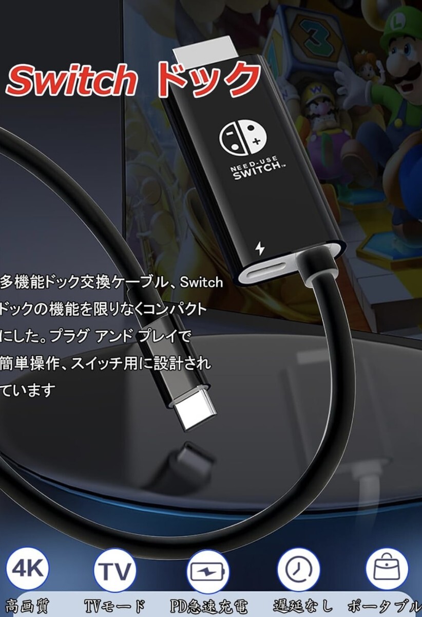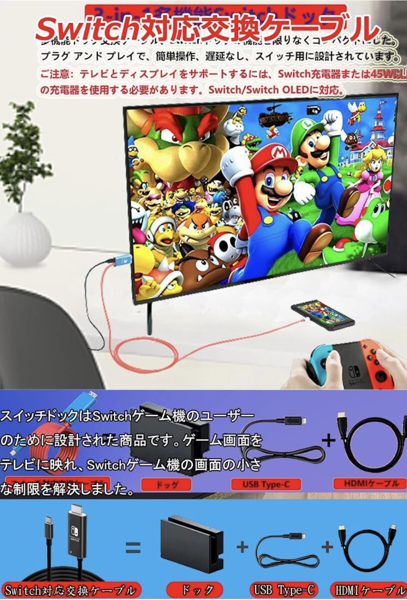 【3in1多機能&Switchミニドック】スイッチドックはSwitchゲーム機のユーザーのために設計された商品です。ゲーム画面をテレビに映れ、Switchゲーム機の画面の小さな制限を解決しました。ユーザーによりリアルなゲーム体験をもたらします。Switch ドック= HDケーブル+ Type-cケーブル+ スイッチ ドック。多機能ドック交換ケーブル、Switchドックの機能を限りなくコンパクトにした。プラグ アンド プレイで、簡単操作、スイッチ用に設計されています。ご注意:テレビとディスプレイをサポートするには、Switch充電器または45W以上の充電器を使用する必要があります。