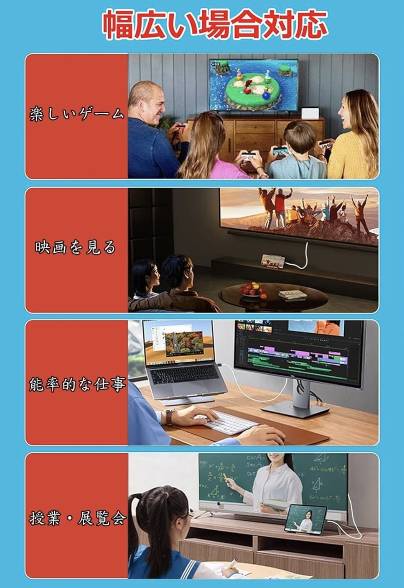 【4K解像度&鮮明な画質】Switch ドックケーブルの最大解像度は4K(3840x2160P)@30Hz、クリアで鮮やかな映像を提供します。Switch/パソコン/タブレット/スマホをHDMIポートを持つのテレビ、モニター、プロジェクターなどの機器に接続できます。クリアな音声と映像を安定かつ効率的に伝送でき、ゲーム映像を完璧に表示します。さまざまなシーンで自分のニーズに合わせて選択できます。Switch/Switch OLEDに対応。注意:出力機器が4Kに対応していることを確認する必要があります(スイッチは1080Pにのみ対応しています)。