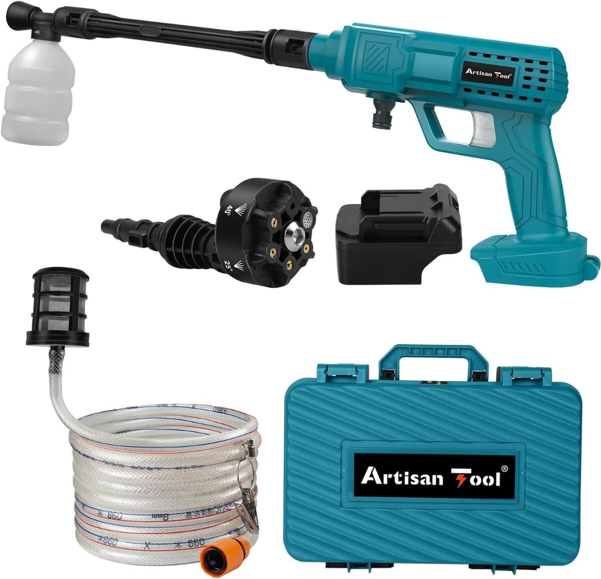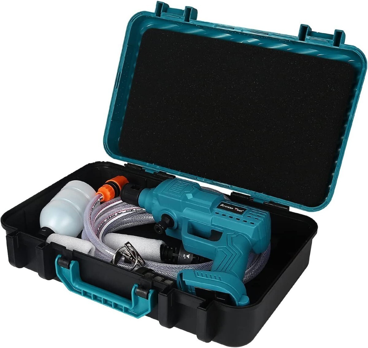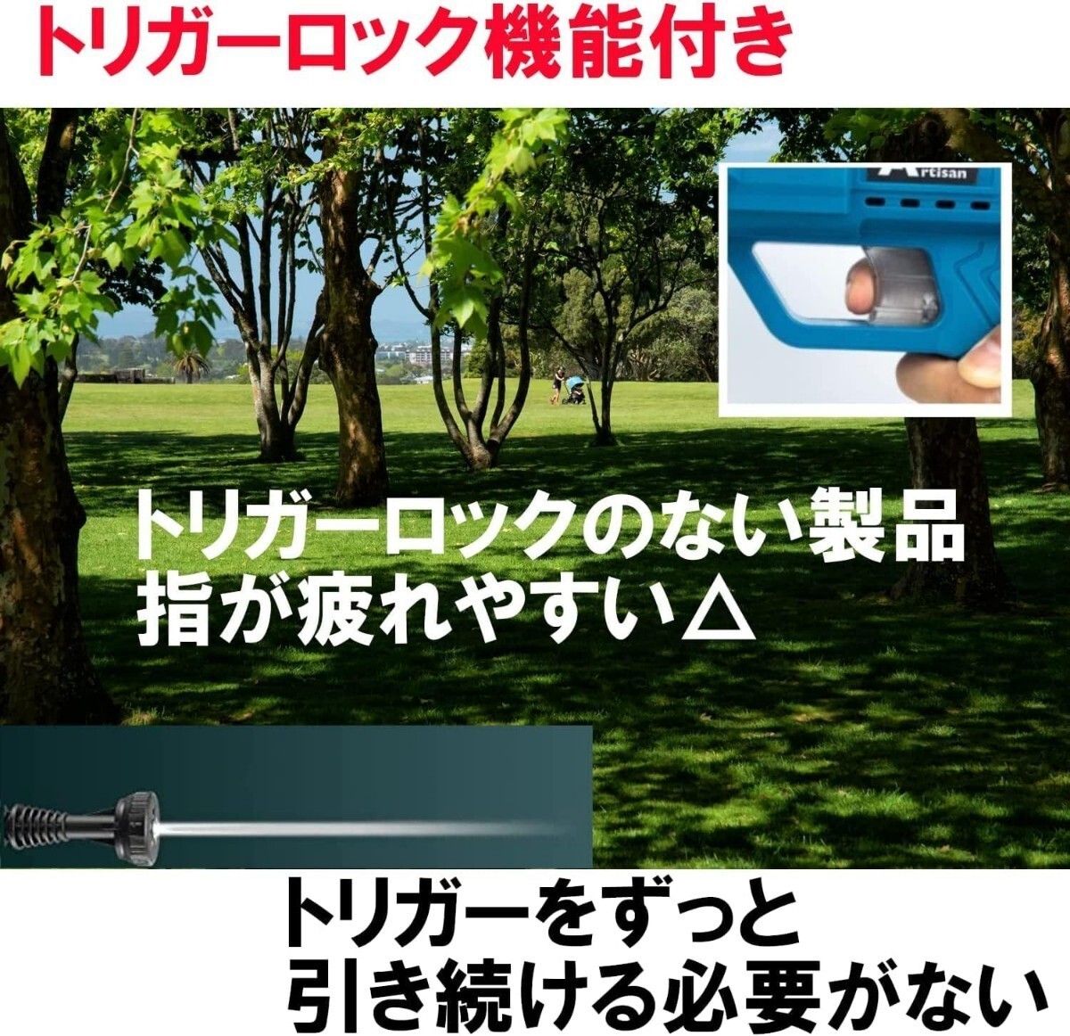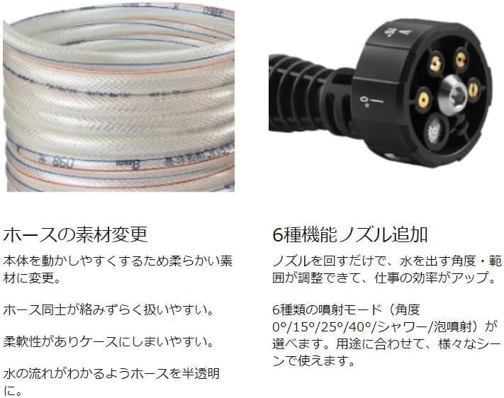 バッテリー別売り 【新型高圧洗浄機の基本仕様&豊富な付属品】本機重量(バッテリー&アクセサリー抜き):1.02 KG  水圧:18vバッテリーの場合、21bar 吐出水量:4.4L/min 高圧ホース:5m 使用温度範囲:0~40℃。豊かな付属品:高圧ホース (5m,フィルター・留め具付)×1 長尺フォームノズルx1 ソープポットx1 6-IN-1多機能ノズルx1 収納ケース 電子取扱説明書の概要×1 【大幅改良】この商品は型番 AT-HP02BKの充電式高圧洗浄機で、多数の改良が施された最新モデルです。①従来モデルに比べ、より高い水圧と吐出水量を実現することができます。②ON固定機能が追加されたことで、作業中の手の疲れを軽減しより快適な作業が可能です。③収納ケースの縮小軽量化により、持ち運びや収納もしやすくなりました。④内部の吸込み部品も改良され、より効率的な吸水ができるようになりました。これによって、作業時間の短縮や省エネルギーが期待できます。⑤6種類の機能ノズルが新たに追加され、バケツに固定金具も追加されました。これによって、様々な用途に応じた作業が可能となり幅広い場面で活躍することができます。 【日立ハイコーキ BSL1860 BSL36A18対応】この高圧洗浄機は、 BSL1860 BSL36A18などのバッテリーが使用できます(※バッテリーは別売りです)。既に日立ハイコーキ18Vバッテリーを所有する方に、この充電式高圧清浄機がおすすめです。既存の日立ハイコーキ18Vバッテリーを利用することができ、追加の購入費用を抑えながら、高性能かつ効率的な作業を実現できます。※マキタ18Vも使用可能 【収納ケース付き】①この充電式高圧洗浄機には、本体や各種アタッチメント(本体、5m高圧ホース、トリガーガン本体、ソープポット、6-IN-1多機能ノズル、長尺ノズル)をスッキリと収納できる、②専用のケースが付属し、使わないときはケースに収納することで、場所を取らずに保管することができます。さらに、ケースごと持ち運びも可能です。本体や各種アタッチメントが一緒に収納できるため、管理がしやすく、作業時に必要なアタッチメントを素早く取り出すことができます。③これらのアタッチメントを使い分けることで、洗浄作業の幅が広がり、より効率的に作業を行うことができます。 【コードレス】コンセントが必要なく、使い勝手が非常に良いため、屋外での作業や車の洗車などに最適です。また、強力な噴射力を持ち合わせており、汚れやホコリをしっかり落とすことができます。愛車の洗車にはもちろん、庭や窓、階段、外壁など、清掃が必要な場所に幅広く活用できます。6種類の機能ノズルが付属し、作業に合わせて使い分けることができます。 【ご注意事項】注意点として、①洗浄機本体に出荷前検品及び動作確認時の水分が残ってる場合が御座います。②バッテリーは附属しておりませんので別売りとなっております。③付属の給水ホースは直接蛇口につなげてご使用いただくことはできません。④接続部分から水漏れする場合はノズルの先端についてるパッキン(Oリング)を附属のパッキンと交換して下さい(電子取扱説明書内に記載)。⑤14.4Vのバッテリーは電圧が弱い為うまく作動しない場合が御座います。⑥定格連続使用時間は約1時間です。30分間使用後は電源を切り本体の熱が下がるまで1時間以上本体を休ませてください。⑦ブラシモートなので、本体窓から火花が見える場合が御座いますが製品としての問題は御座いません。⑧配送過程で簡易的なケースにヒビが入ることがあるため、本体を保護するためのものではありますが、完全に保護されるわけではないことにご注意ください。