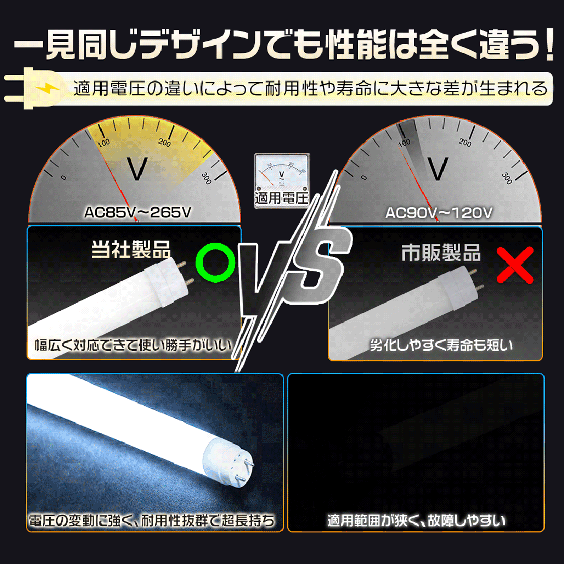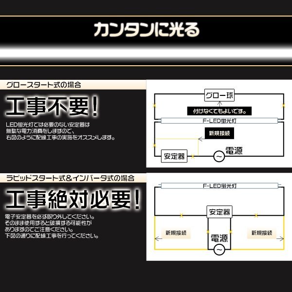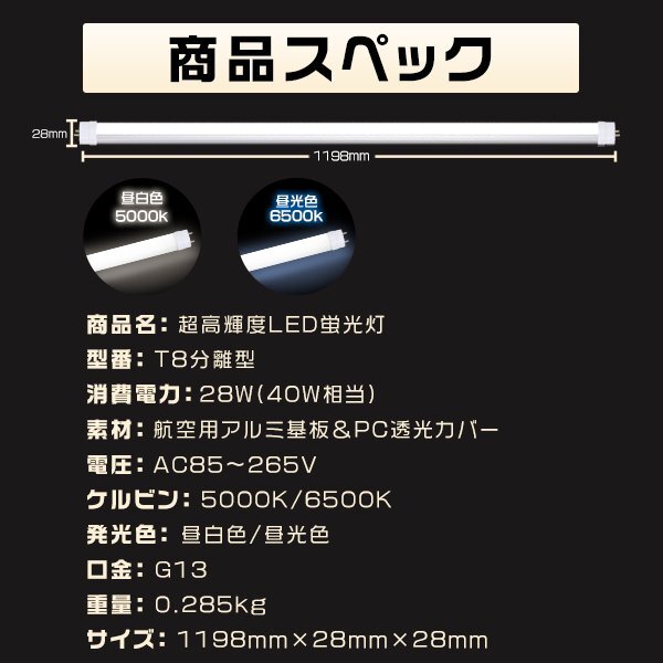 落札後、ご希望の色温度は必ずオーダーフォームにご記入ください。 選択してない場合、ランダムにお届けいたしますので、ご了承ください! 超高輝度LED蛍光灯 40W形 グロー式器具工事不要 【製品仕様】 口金:G13(蛍光灯タイプ) 定格電圧:AC85-265V 消費電力:28W(40w相当) 全光束:4500LM 色温度:昼光色(6500K)/昼白色(5000K) 材質:航空用アルミ基板+PC透光カバー ※明るさは色温によって異なりますのでご注意ください。 ※使用上の注意 ・グロースターター式の器具の場合は工事不要で、グロー球を外すだけで使用できます。 ・ラピッド式・インバーター式の器具の場合は直結工事しても使用できます。安定器によって使用できないことが判明した場合はご返品対応いたします。 【保証について】 ◇保証について、2年間になります。