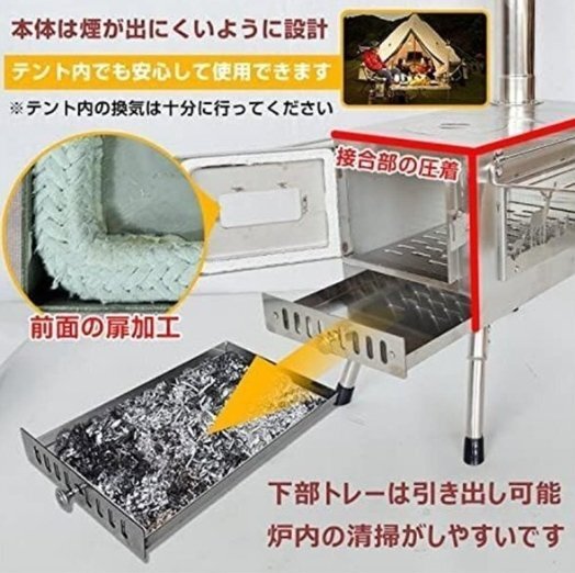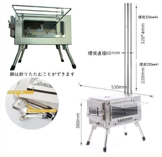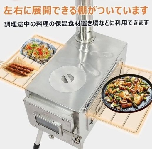 薪 ストーブ アウトドア 調理器具 暖炉 キャンプ 折りたたみ 煙突付き 耐熱ガラス窓付き 棚付き 組立式 屋外 焚き火台 BBQ 暖房 ステンレス