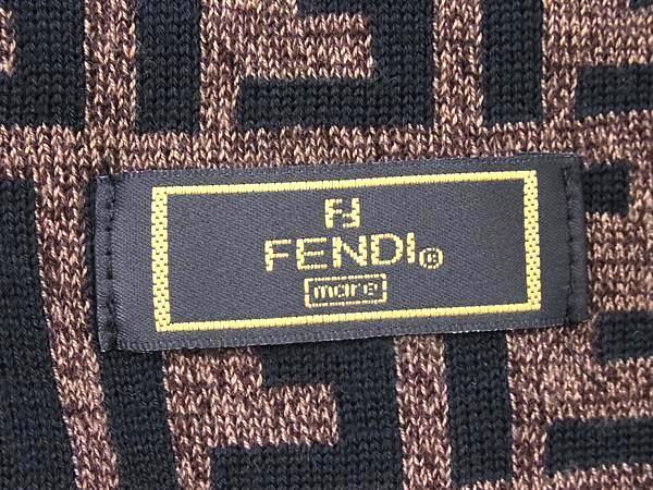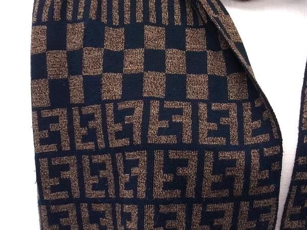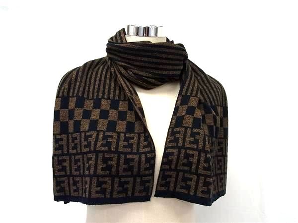 1円 ■美品■ FENDI フェンディ ズッカ柄 マフラー ストール ショール 防寒具 レディース メンズ ブラウン系×ダークネイビー系 FP9284