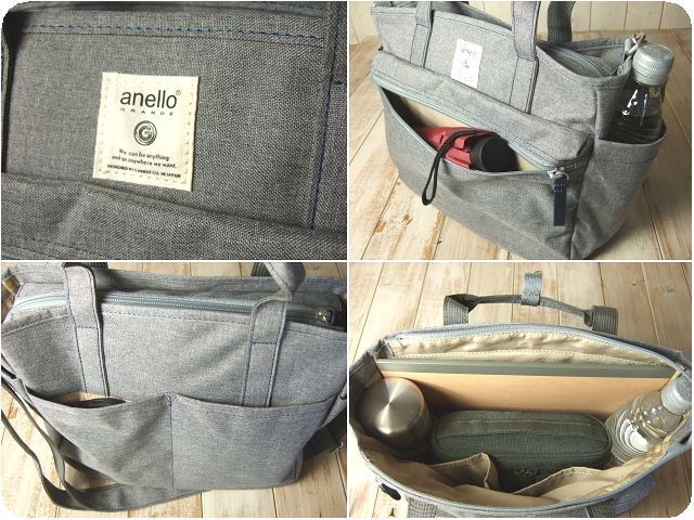 使いやすいシンプルな形で、A4サイズや500mlのペットボトルが入るサイズ感です。配色のステッチとファスナースライダー、【anello】「GRANDE」のコットンネームがアクセントになっています。
