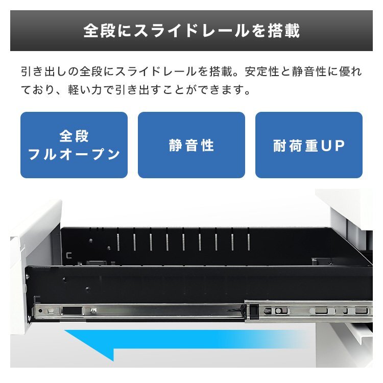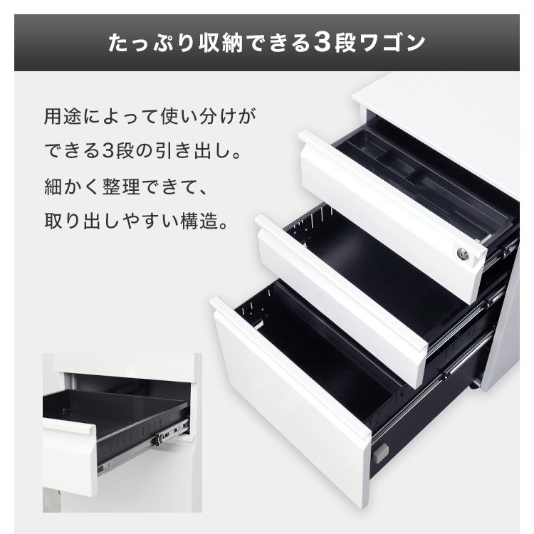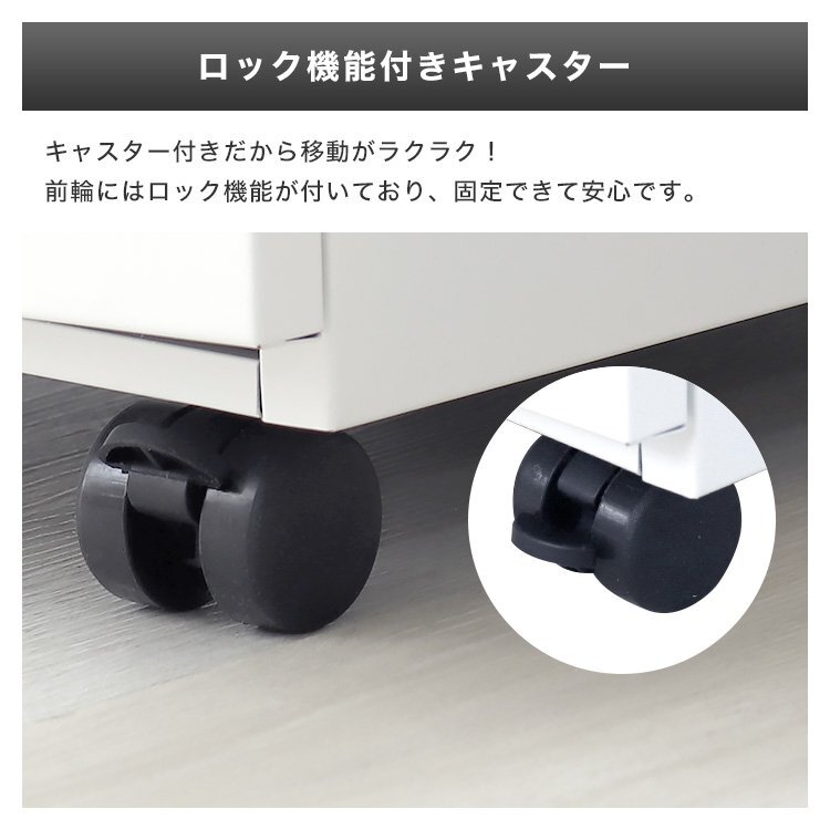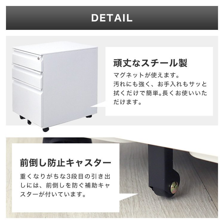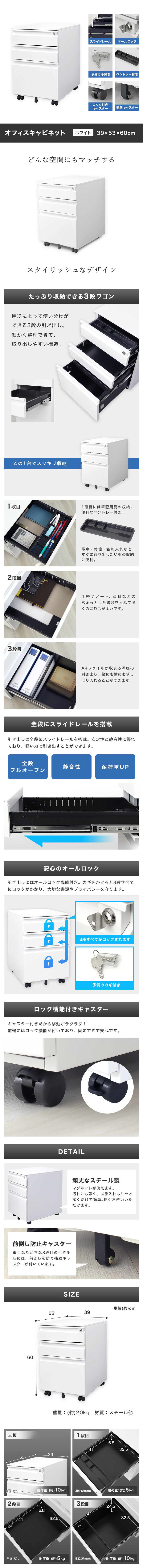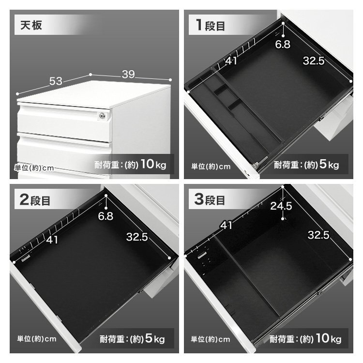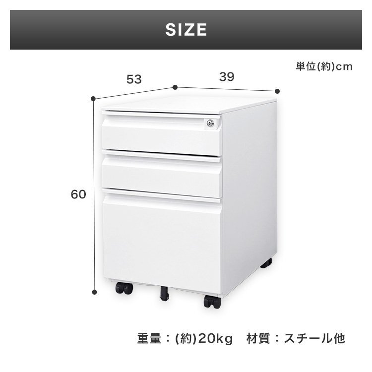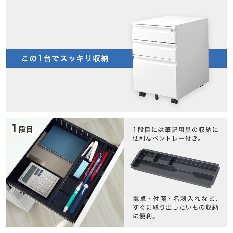 使いやすさ抜群のシンプルデザイン。デスクに合わせやすいホワイトカラー! たっぷり収納できる大容量の収納容量!下段はA4ファイルを収納可能。 全段フルオープンで奥の収納物も取り出しやすい! 安心のオールロック!鍵を掛けると全段ロックでセキュリティも万全です。 キャスター付きで移動ラクラク!デスクの下に入れても、デスク横に置いて作業スペースとしても使えます。 丈夫なスチール製。さらにマグネットも使えて使い方色々! 【商品仕様】 本体 ペントレー ×1 鍵 ×2 カラー:ホワイト 素材:スチール 他 重量(約):20kg サイズ(約):幅390×奥530×高さ600mm 【引き出し内寸】 上段:(約)幅325×奥行410×高さ68mm 中段:(約)幅325×奥行410×高さ68mm 下段:(約)幅325×奥行410×高さ245mm 【耐荷重】 上段:(約)5kg 中段:(約)5kg 下段:(約)10kg 天板:(約)10kg |