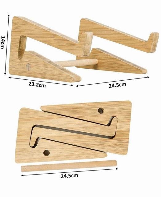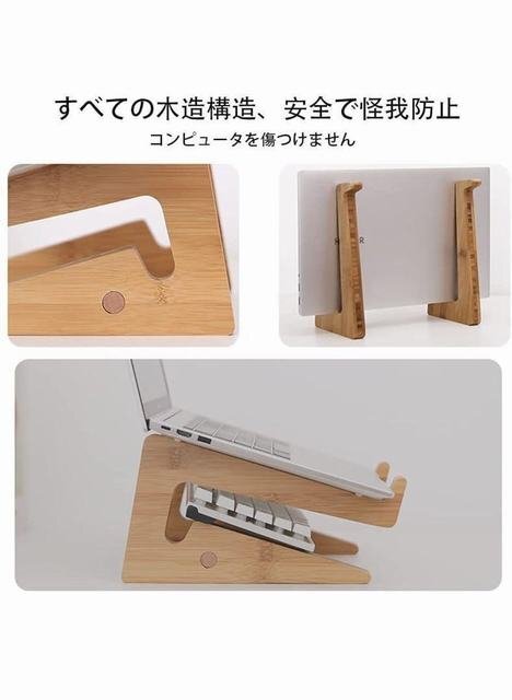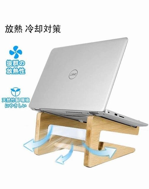 "【一台多役?ノートパソコンスタンド&収納ラック】 ノートパソコンスタンドとしてはもちろん、縦置きすればノートパソコンを収納でき、スペースを有効活用できます。 【天然素材を採用?安定性抜群】 竹製がお洒落なPCスタンド。厳選されたフィービーウッドを採用し、ご使用中にノートパソコンに傷がつかないように、完全に竹でできております。落ち着いたカラーでインテリアにも馴染んでくれます。竹と三角形の構造を組み合わせることで、使用時の安定性を確保し、タイピング時に揺れません。 【姿勢改善に?人間工学に基づいたデザイン】 人間工学に基づいて設計された傾斜角度により、画面の高さと視線が拡大し、肩や首などへの負担を大幅に軽減してくれます。デスクが低いためデスクワークの際に腰に負担がかかってしまっていたが、本製品を使うことによってパソコンを目線と同じ高さにする事で背筋が伸び、猫背などを防止できます。リモートワークやテレワークに必需品。 【抜群な放熱効果】 ラップトップスタンドには、十分な換気および放熱機能があり、 ベースと空気の間の接触面積を増やして放熱を促進します。"