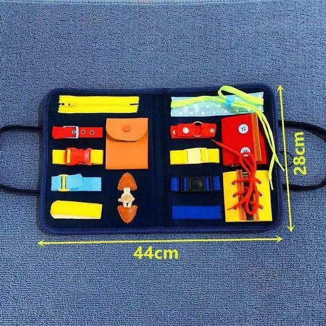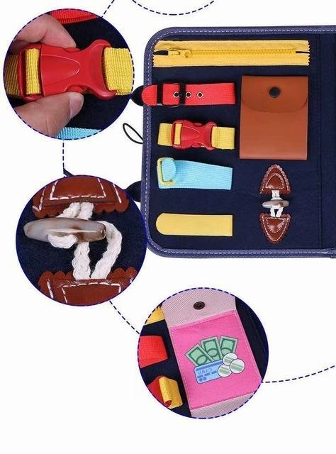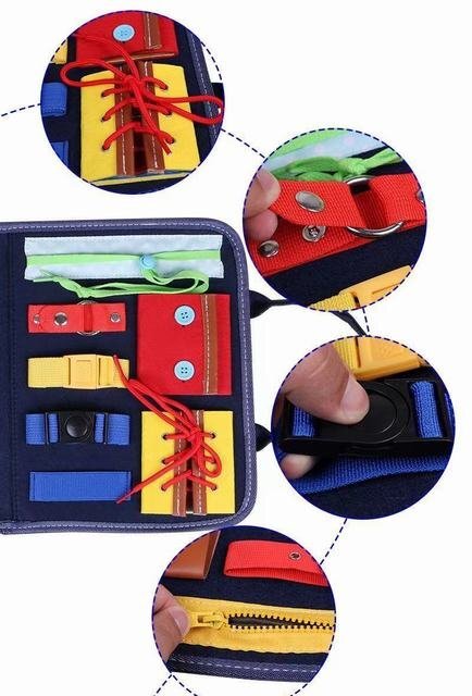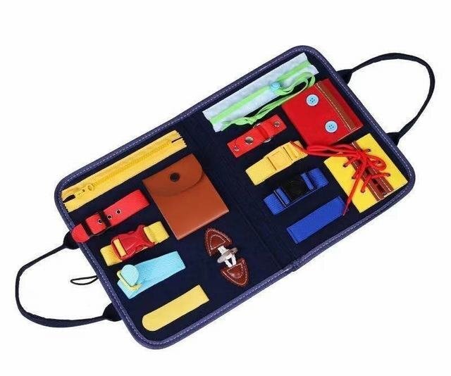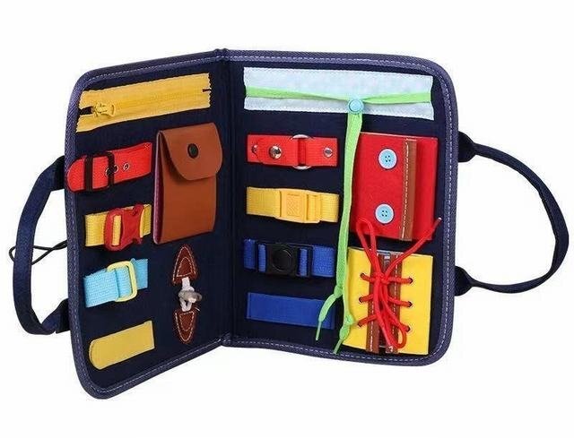 ボタン、スナップボタン、ダッフルボタンのかけ外しや、ジッパーの開閉、紐通し、くつひも結び、ちょうちょ結びなど、様々な指先の知育遊びできるバッグのセットです。 薄くかさばらず、お片付けもしやすく、持ち運びにも便利です。 効果としては、 ◎目と手先の協同作業 ◎指先のトレーニング ◎集中力、想像力、巧緻性 ◎知能 ◎運動能力 ◎色の識別 などが期待できます。 ひもとおしなどは、幼児期にとても大切な知育の取り組みであり、モンテッソーリやシュタイナー教育でも使われています。
