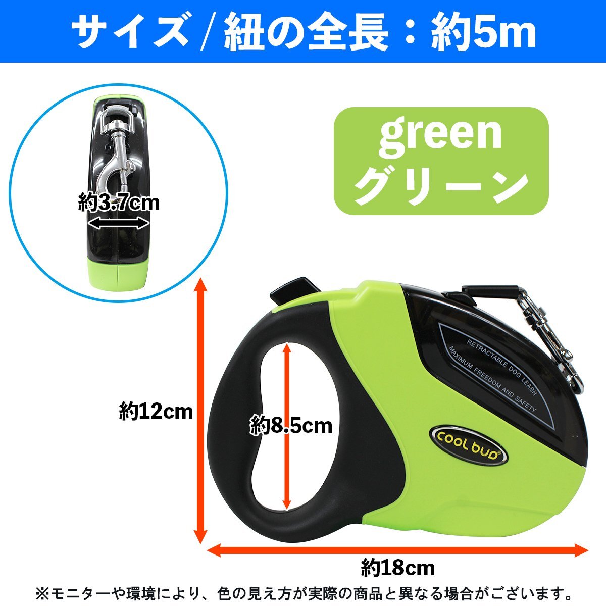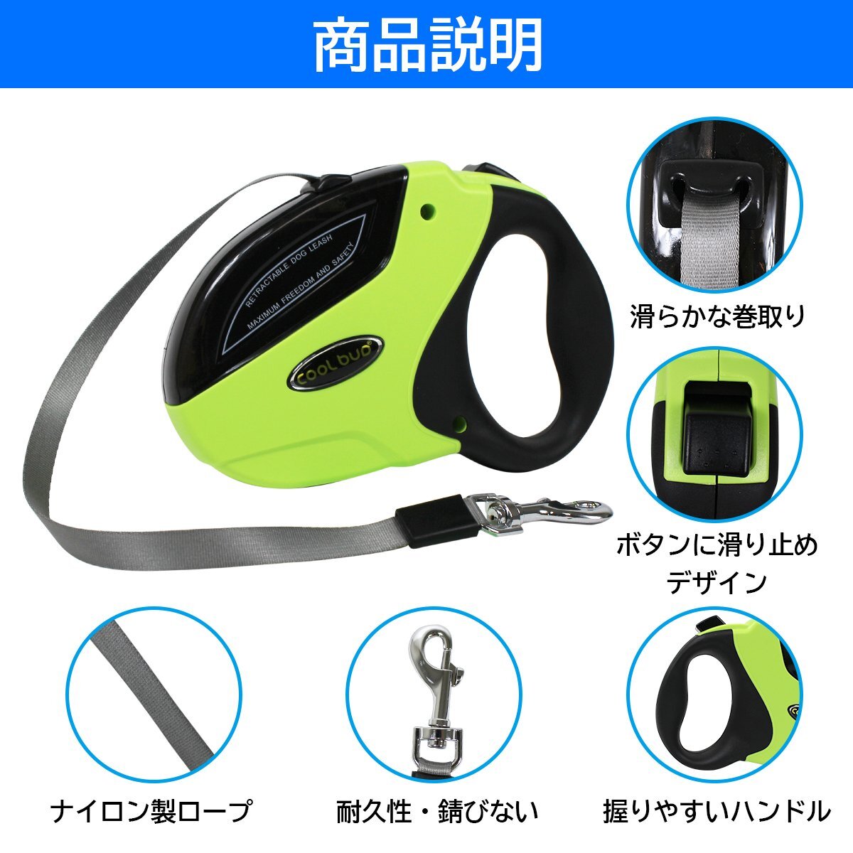 便利なロック機能付き!犬用 伸縮 リード 5m/5メートル 自動巻き取り グリーン 緑 ペット 散歩 小型犬 中型犬 犬 ヒモ