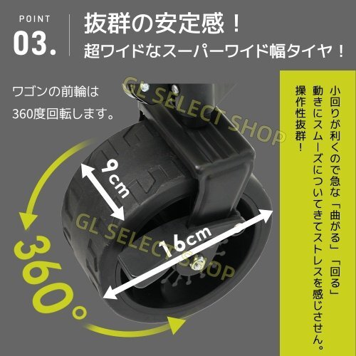 • 【抜群の安定感!超ワイドなスーパーワイド幅タイヤ!】ワゴンの前輪は360度回転します。小回りが利くので急な「曲がる」「回る」動きにスムーズについてきてストレスを感じさせん。操作性抜群!