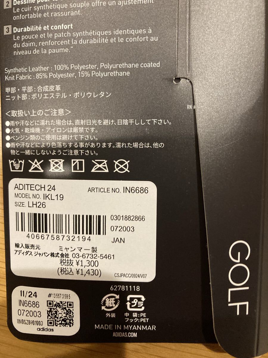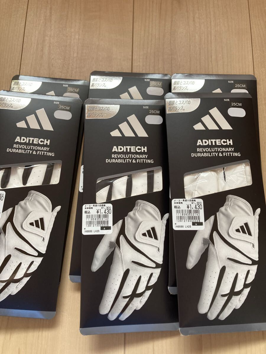耐久性とフィッティングに優れたadidasのゴルフグローブ、6個セット、サイズ26cm。