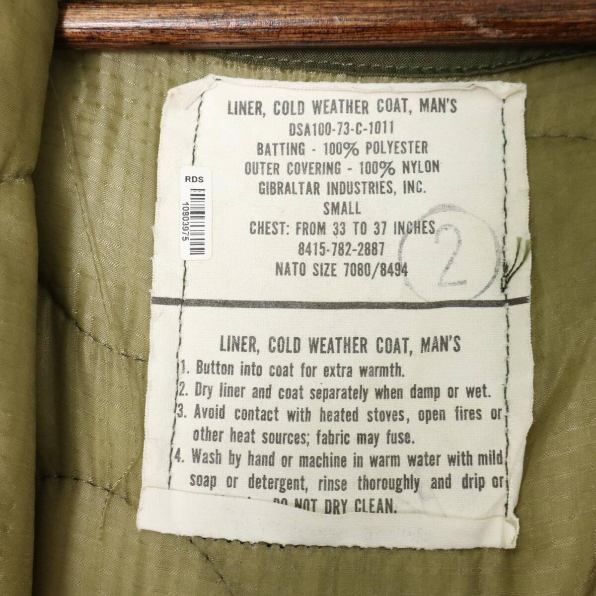 | 【商品管理番号】 A1832 【ブランド】 /米軍実物 U.S.ARMY 【サイズ】 SMALL REGULAR 【実寸サイズ】 肩幅:約46cm 着丈:約78cm 身幅:約50cm 袖丈:約62.5cm 【主な素材】 表地 : ナイロン 【色】 オリーブ 【仕様】 70年代 1973年 ミリタリー M-65 フィールドジャケット 3rd 【状態】 特記事項: 右袖口に僅かな汚れ、両袖ワッペンの跡がございます。着用に問題はございません。 【付属品】 キルティングライナー付 | |||