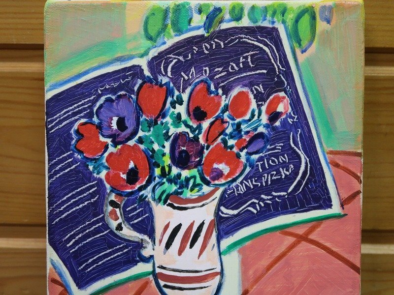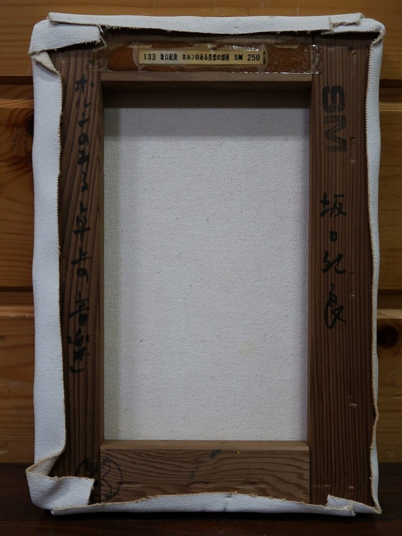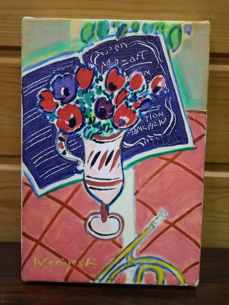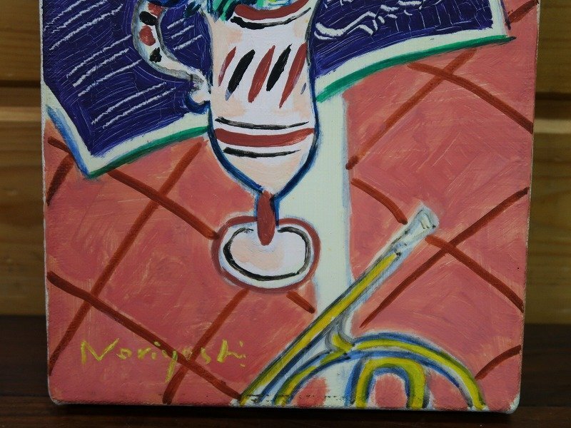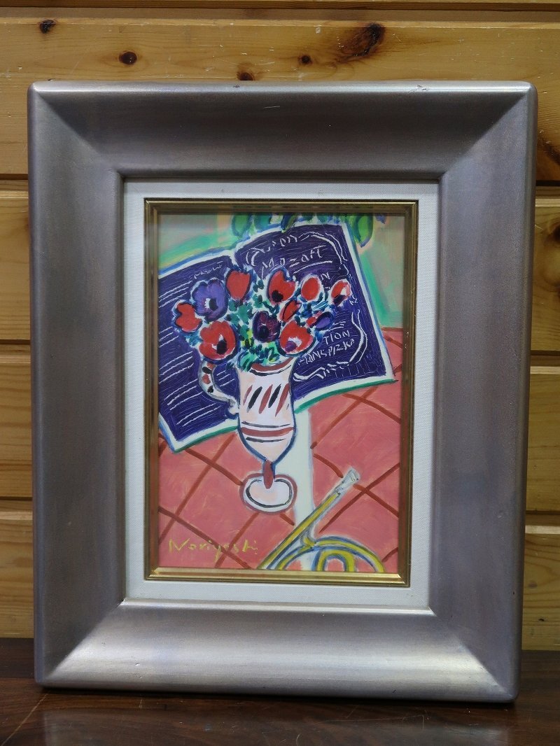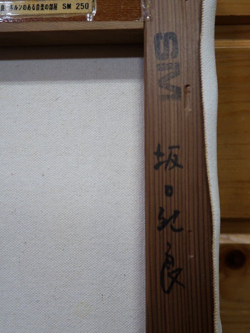 【青宝】112044坂口紀良「ホルンのある卓上の音楽」油彩SM 肉筆額装(4305945-2/332)