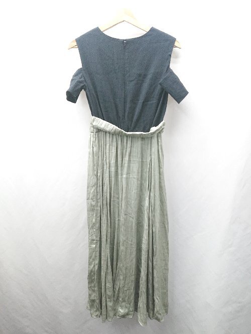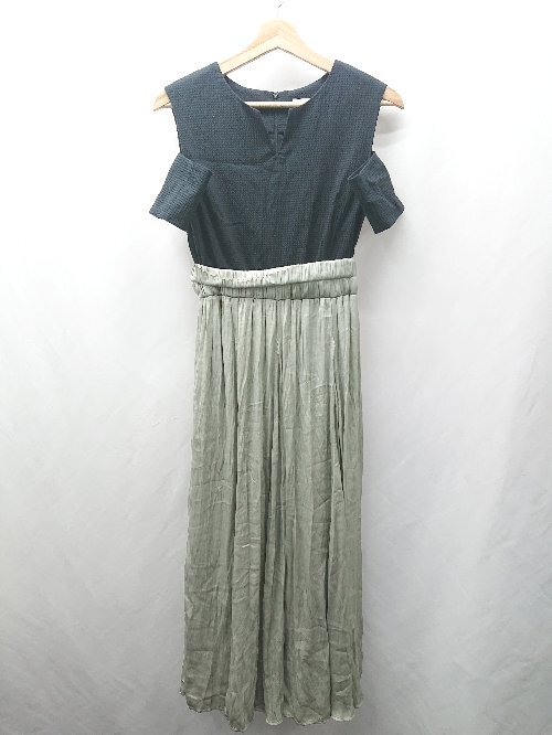 ◇ ⊂ MIELI INVARIANT オープンショルダー ウエスト切替 半袖 ロング ワンピース サイズF グリーン ブラック レディース E