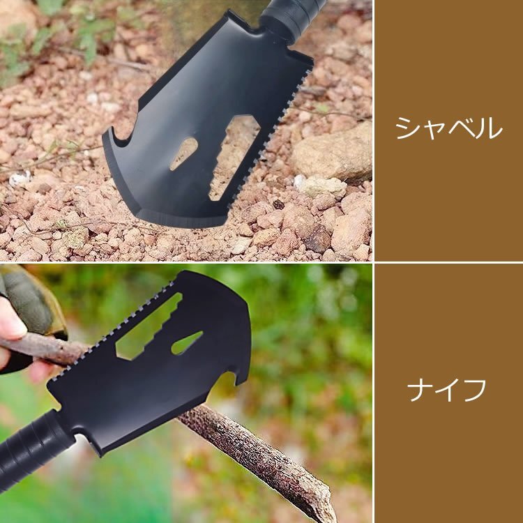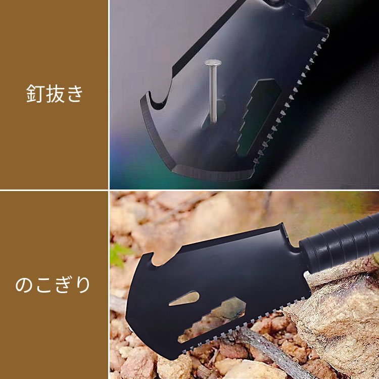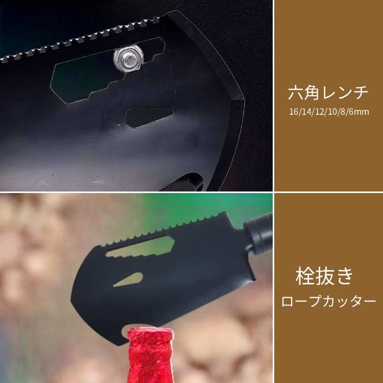 土堀り用シャベルとしてだけでなく、のこぎり・ナイフ・栓抜き・釘抜き・六角レンチとしても利用できます。