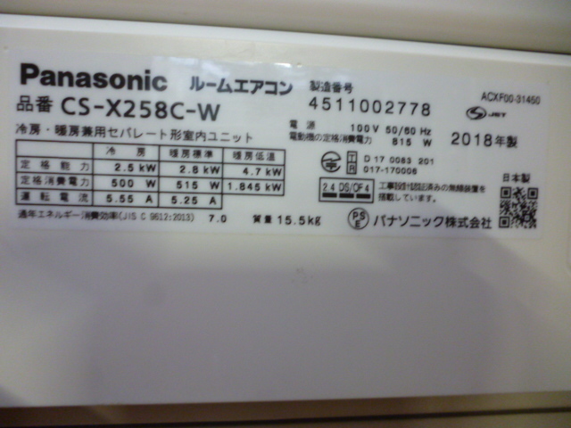 | S004 パナソニック ルームエアコン 主に8畳 CS-X258C-W | |||