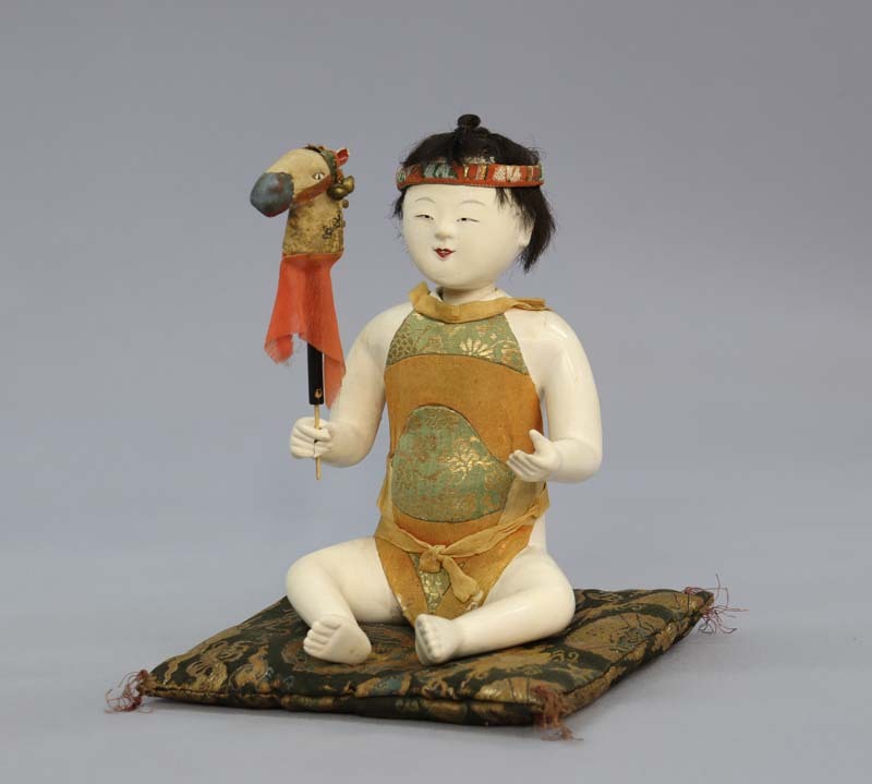 ボディは張子に胡粉仕上げ、金襴と縮緬の腹掛けは木目込み風に着せられています。