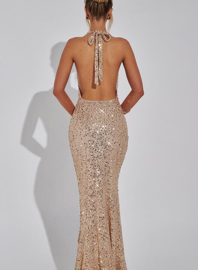 405 ワンピースladiesレディース ◇ 綺麗めシルエット ◇ 素敵   ホルターネック  ドレス  透け   ゴールド