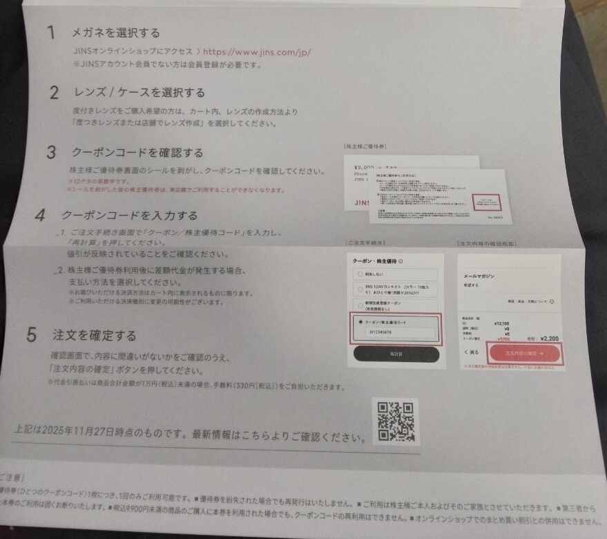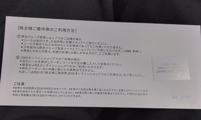 送料無料 ジンズ 株主優待券×1枚 2026/8/31期限